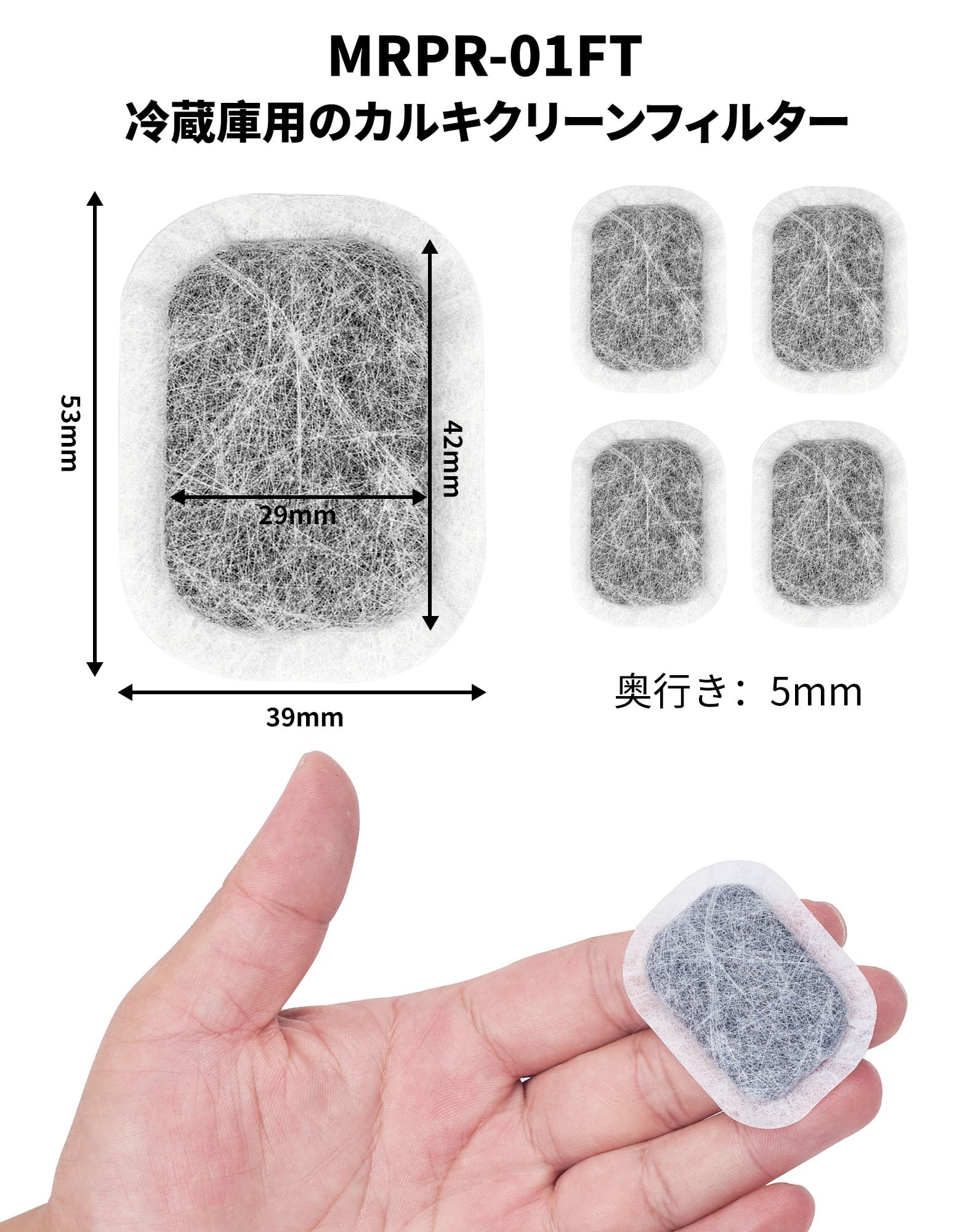 【対応形名】MRPR-01FT三菱電機(MITSUBISHI ELECTRIC) 冷蔵庫用のカルキクリーンフィルターです。(給水タンク内にセットする浄水フィルター)( M20CM5526/M20VJ5526 の互換品、M20KW0526/M20KWO526 と同じサイズ)。材質:ポリエステル・活性炭、サイズ:長53mm×幅39mm×奥行き5mm。機能:水道水をろ過して水中に含まれる不純物を除去し、できた氷はカルキ臭さを低減します。