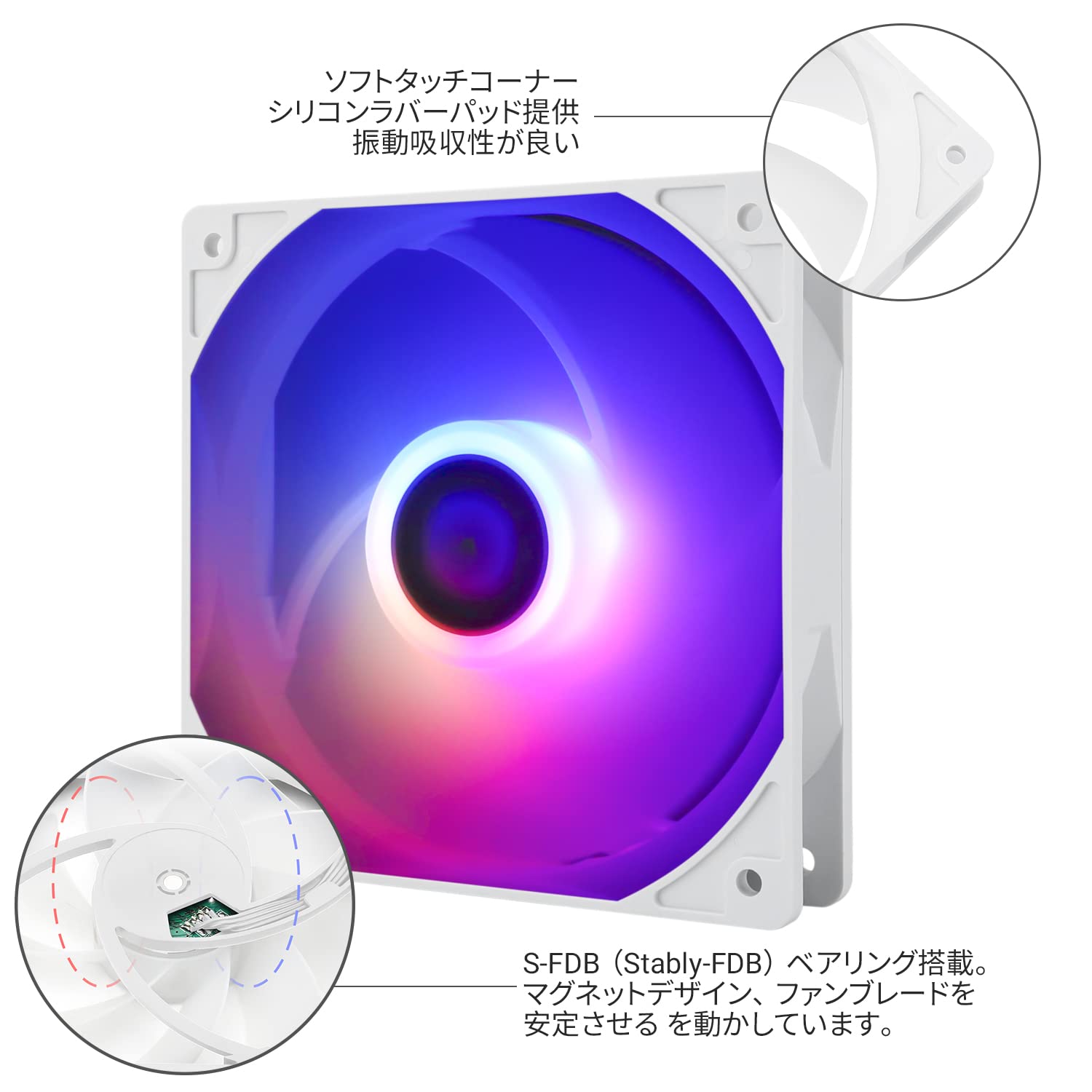 【高品質ベアリング】慎重に開発された高品質のS-FDBベアリングは、リフティングモードでのPC冷却ファンブレードの揺れの問題を解決し、ファンのノイズを最小限に抑えながら、必要に応じて最大の冷却性能を提供し、ファンの寿命を延ばします。