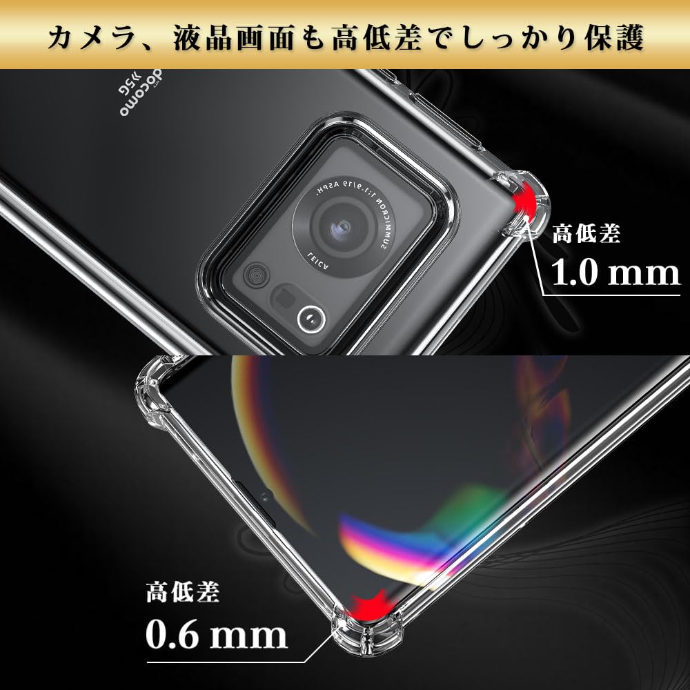 【カメラ、液晶画面は浮かせて保護】スマホを机などの平面に置いた場合に、液晶画面やカメラレンズが接触してできるキズが最小限に抑えられるよう、表側(液晶画面側)は0.6mmの、裏側(背面側)は1.0mmの高低差をつけ、浮かせることで傷や摩擦からガードします。
