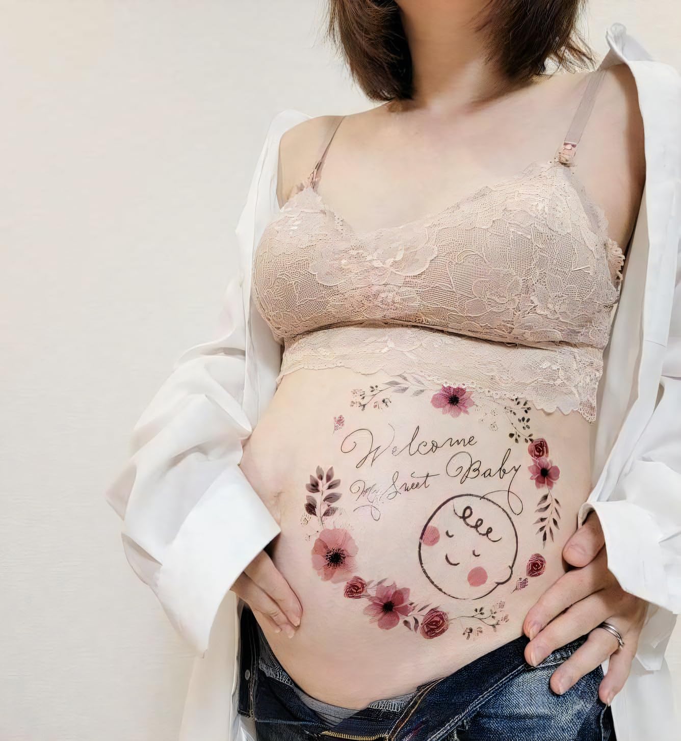 貼り付けに時間がかからず簡単にマタニティフォトが撮影できます。 落とすのも簡単で時間はかかりません。 ボディペイントよりも早く簡単に利用することができます。