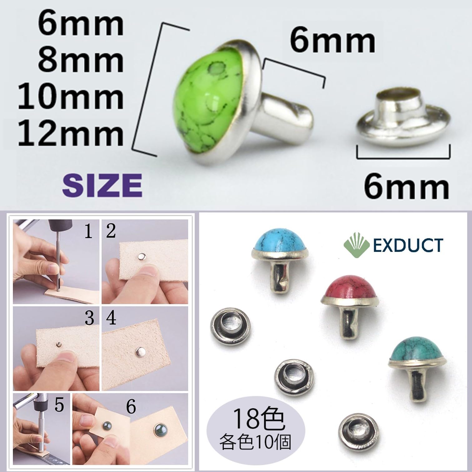 スタッズ カシメ ターコイズ 6mm 18色 180個 セット ハトメ かしめうち具 レザークラフト リベット 革