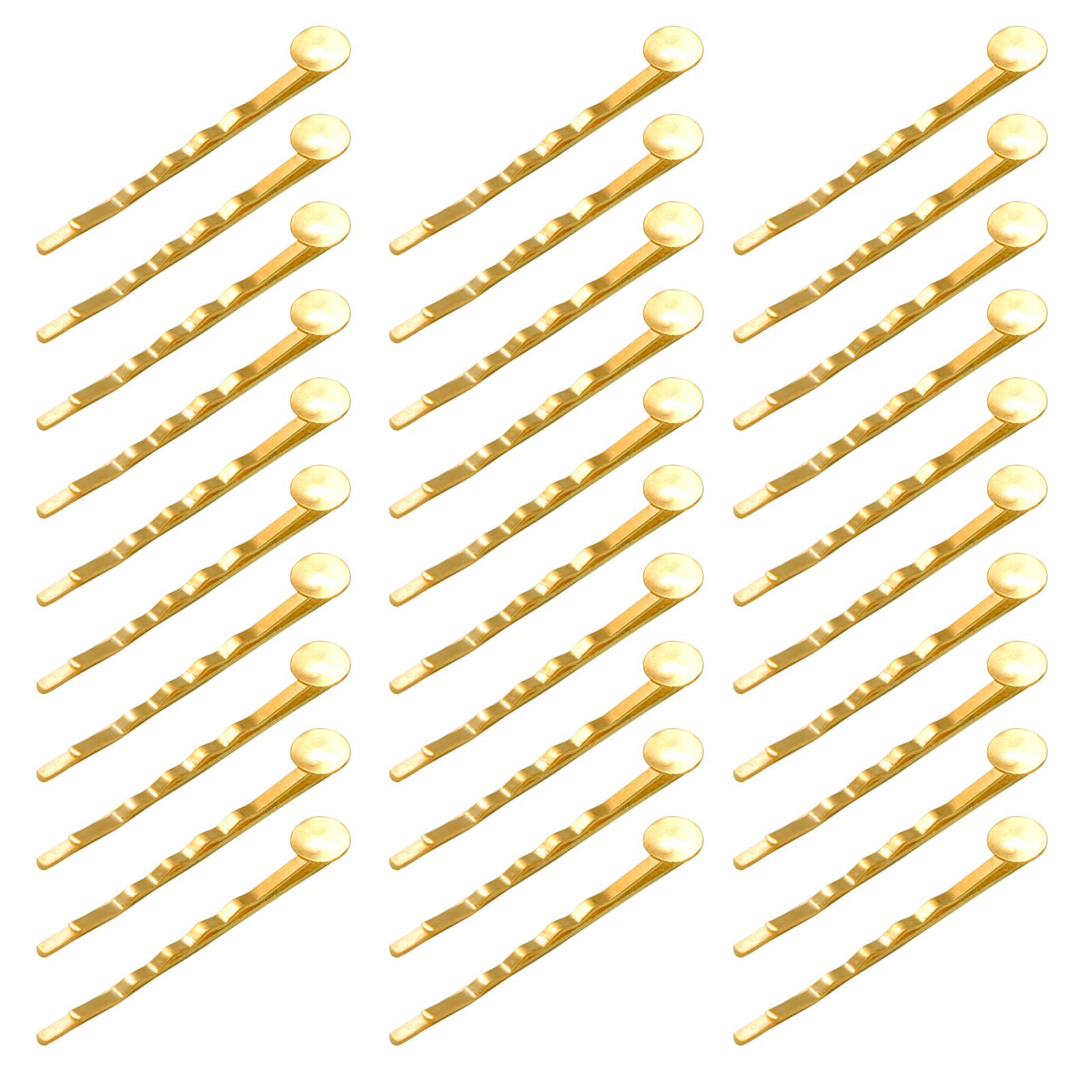 直径8mmの円形台座つきヘアピン 30個セットです。長さ(約)58mm / 台座直径(約)8mm / 重さ(約)1g / 素材:合金。色:ゴールド。台座つきなのでお気に入りのパーツを載せてオリジナルのヘアピンが作れます。いろいろ試して作れる30個セットです。