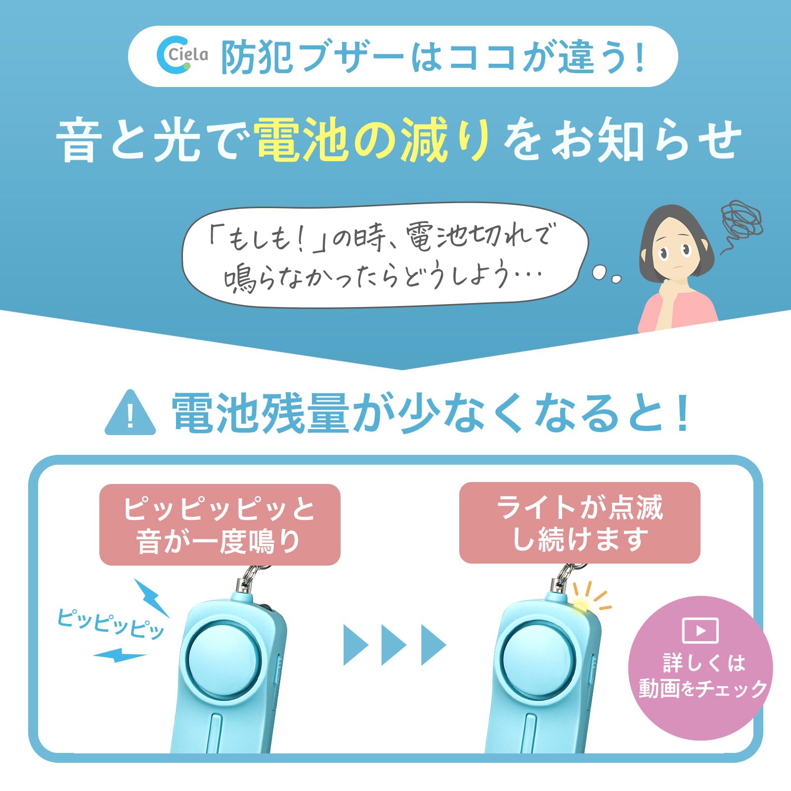 【??電池は切れる前にお知らせ】「もしもの時に、鳴らなかったら?」そんな不安の声にお応えして、Cielaの防犯ブザーは【電池切れお知らせサイン】を搭載!電池が消耗すると「ピピピッ」と音がした後、LEDライトが点滅します。電池は単四で交換も簡単。