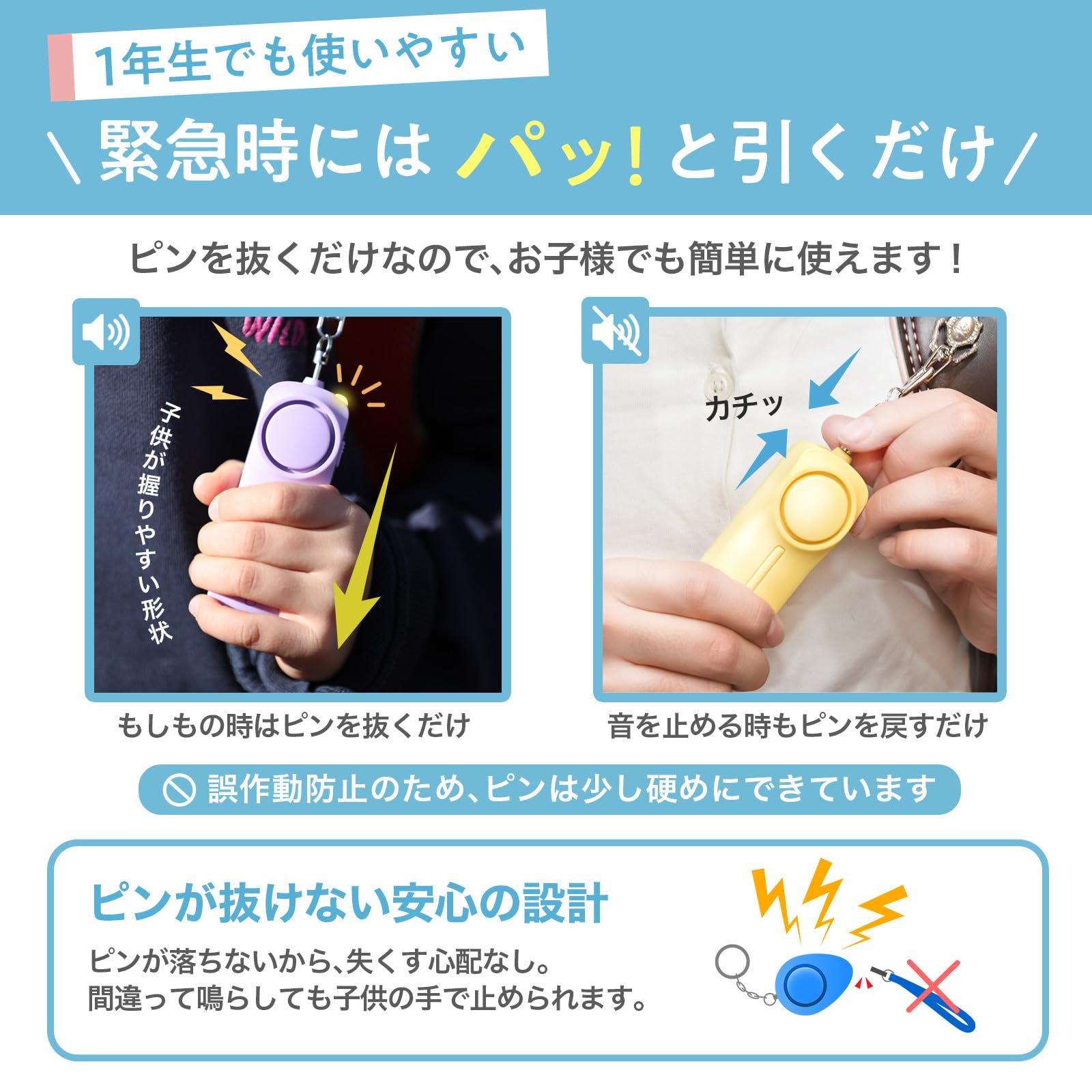 【??ピンが抜けない】ピンは本体から抜け落ちないため「ピンを失くして音を止められない!」という不安がありません。ランドセルに付けていると「ウッカリ」鳴らすことも。止める操作が簡単なので小学生のお子様でも安心です。
