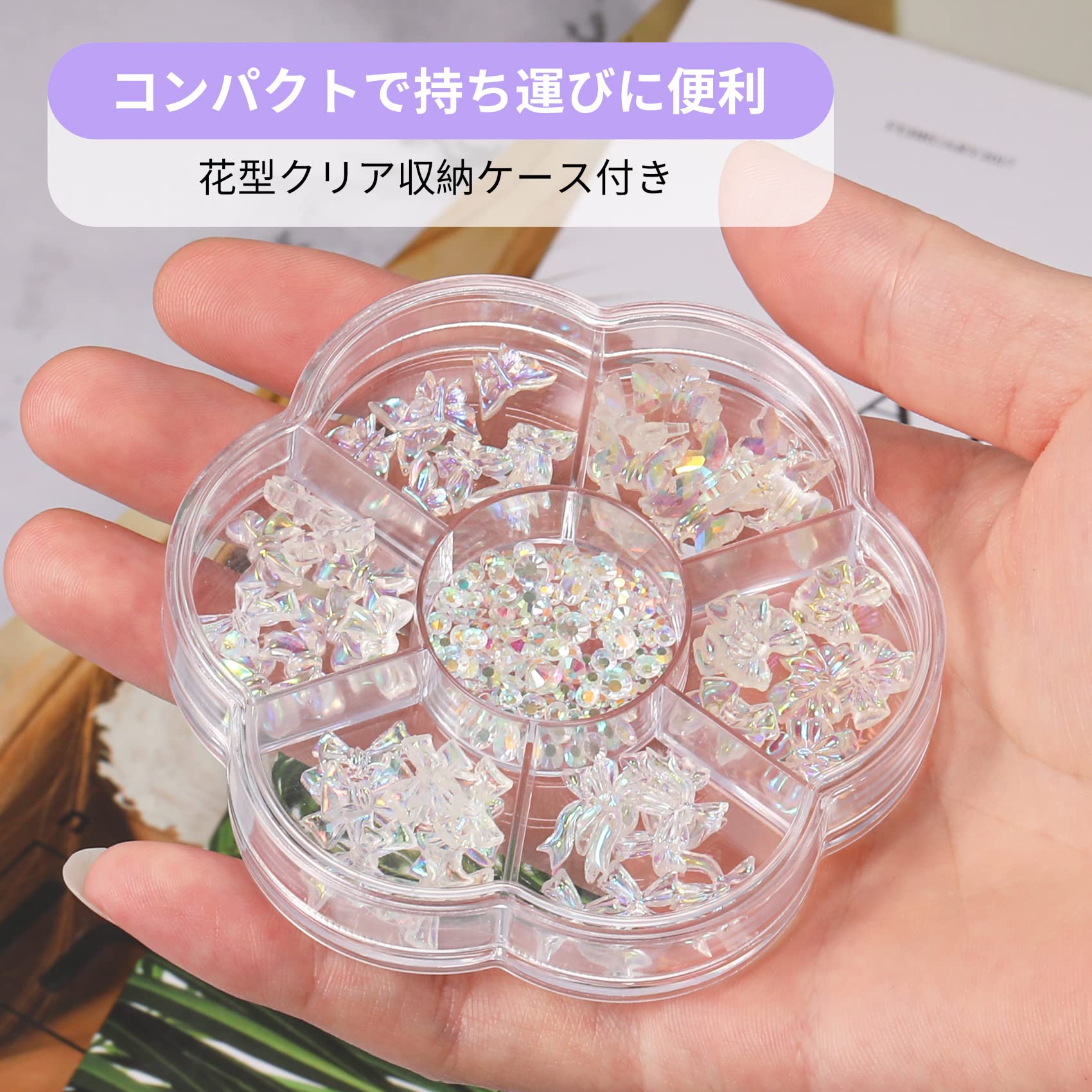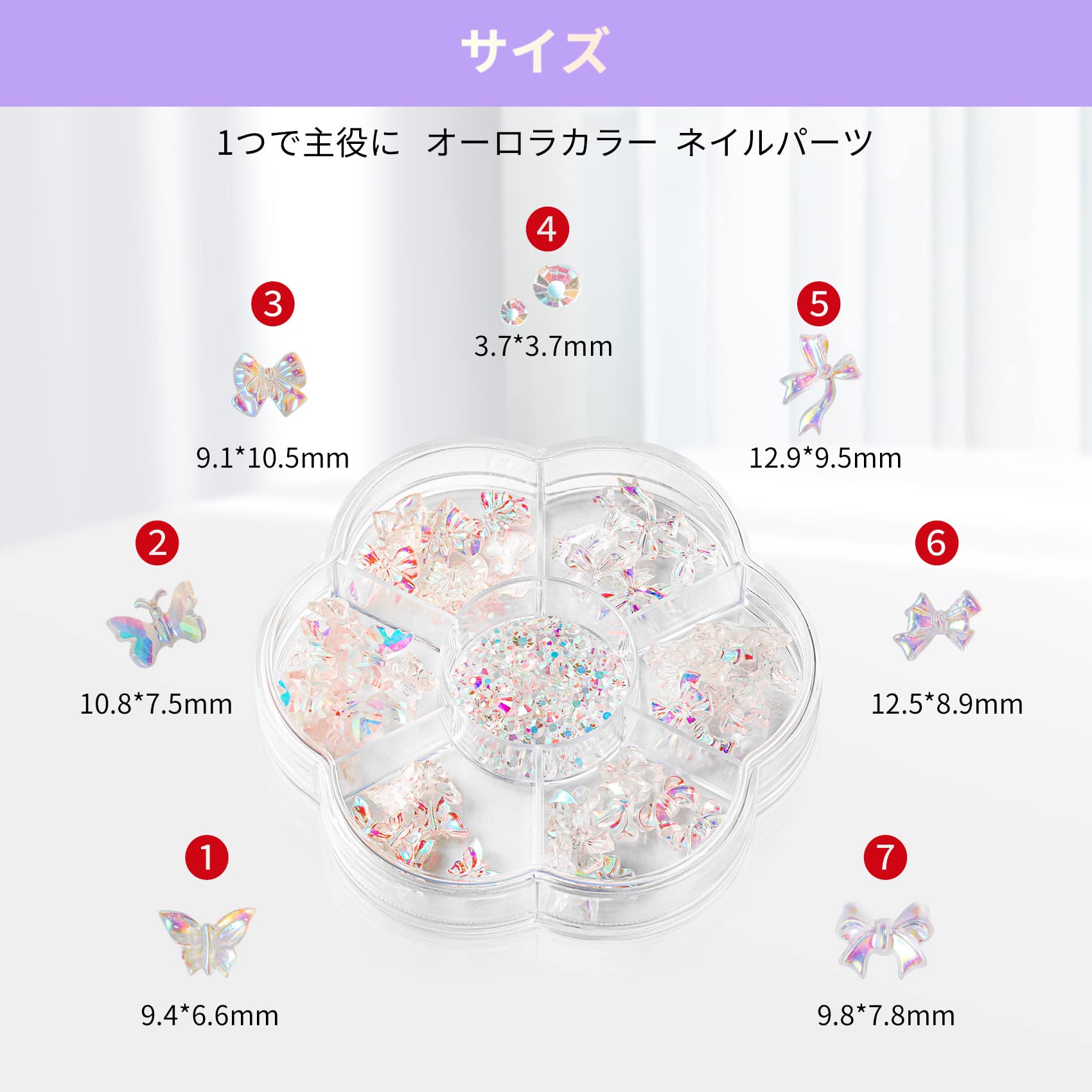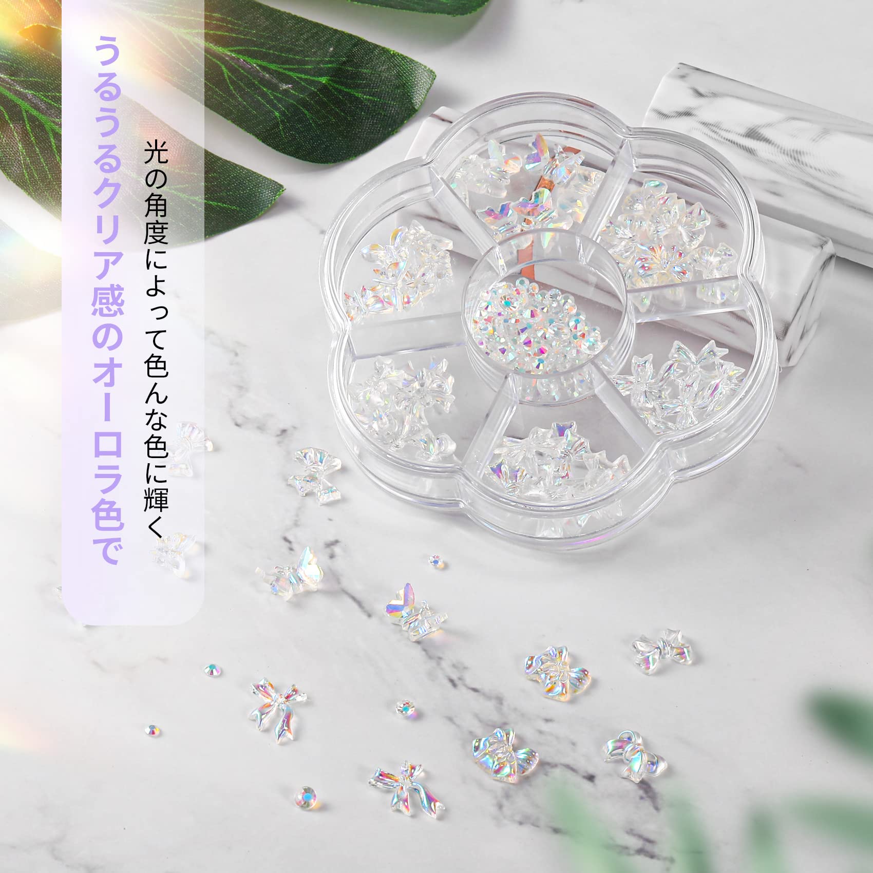 かわいいネイルパーツセット:リボン、蝶、ラインストーンなど流行りのネイルパーツが揃ったジェルネイルパーツセットです。うるうるクリア感のオーロラ色で可愛くて、光の角度によってきらめく光を作り出し、指先の魅力をより鮮やかに、女性魅力アップ!