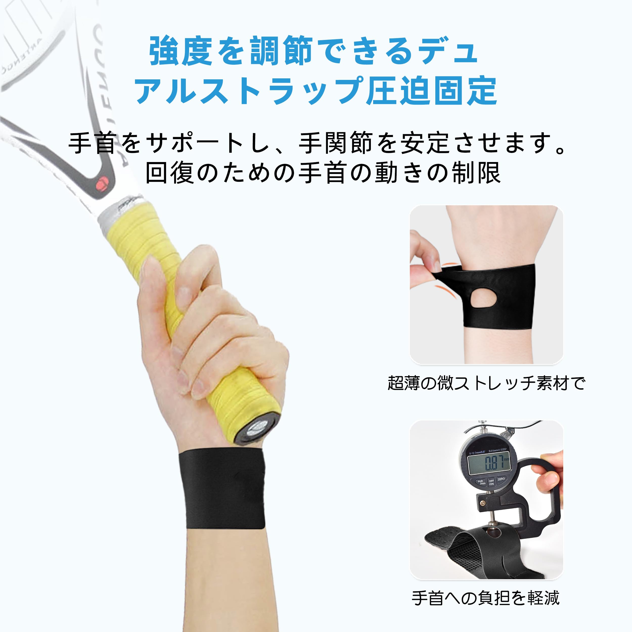 【高弾性で調節可能】:超薄型 TFCC リストラップは高弾力素材を使用しており、マジックテープのデザインで締め具合を調整できるため、締めすぎによる手の血行不良やしびれを防ぎます.