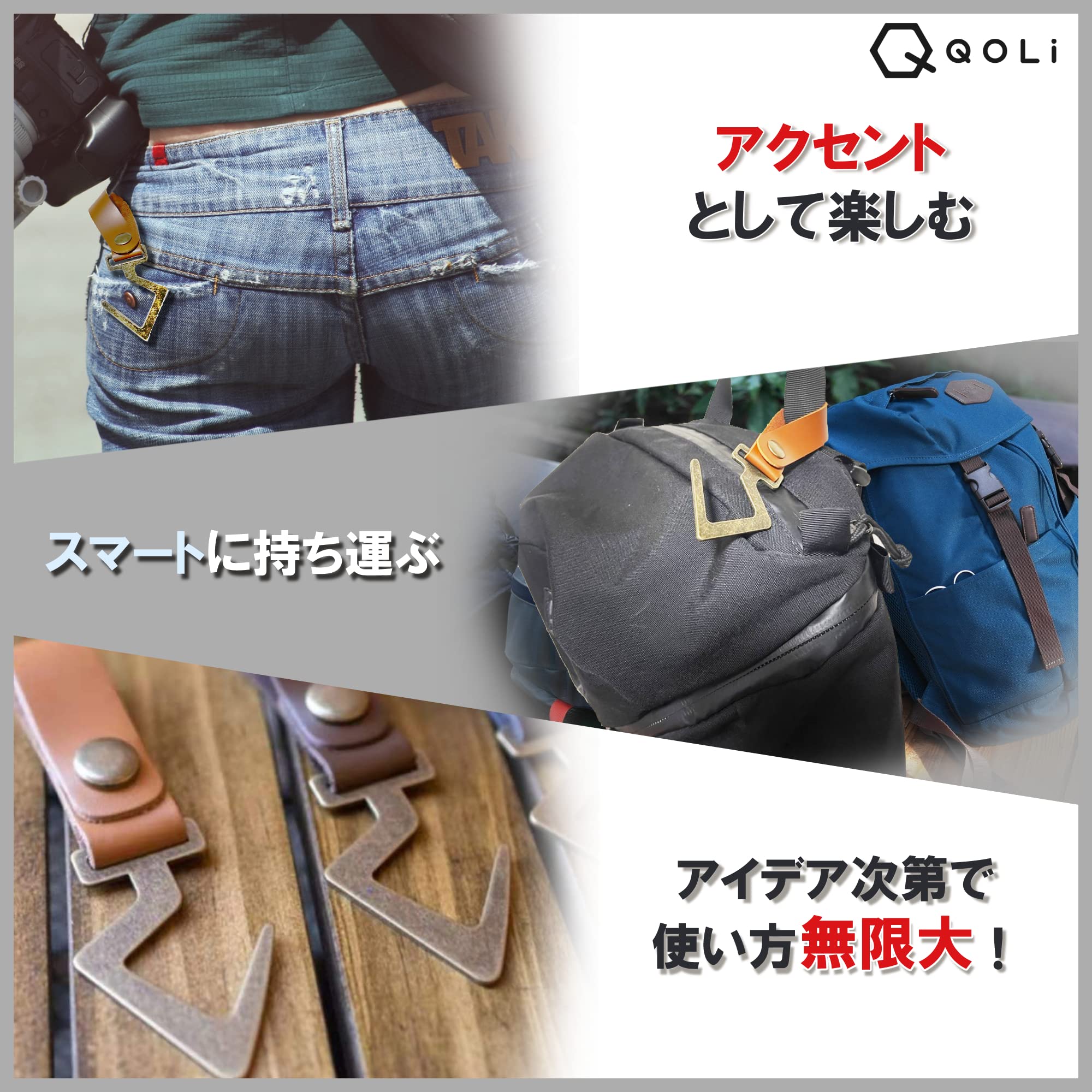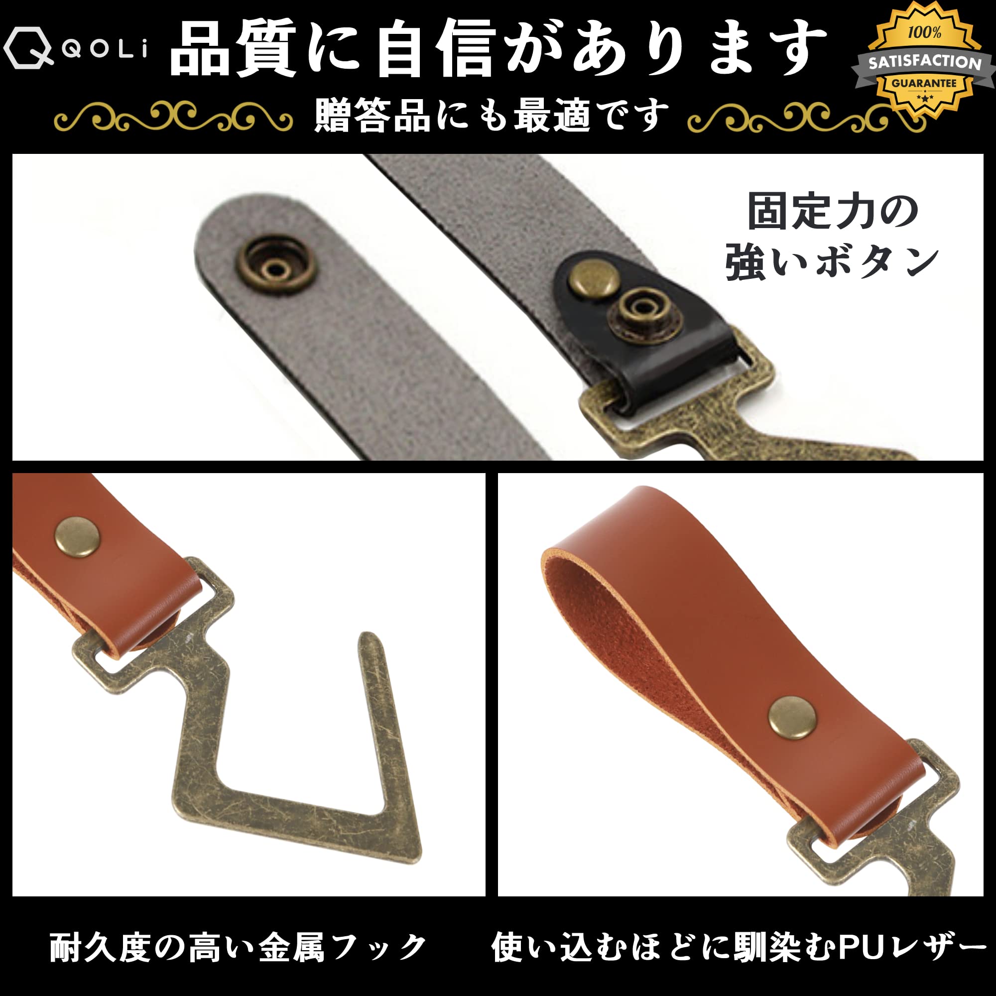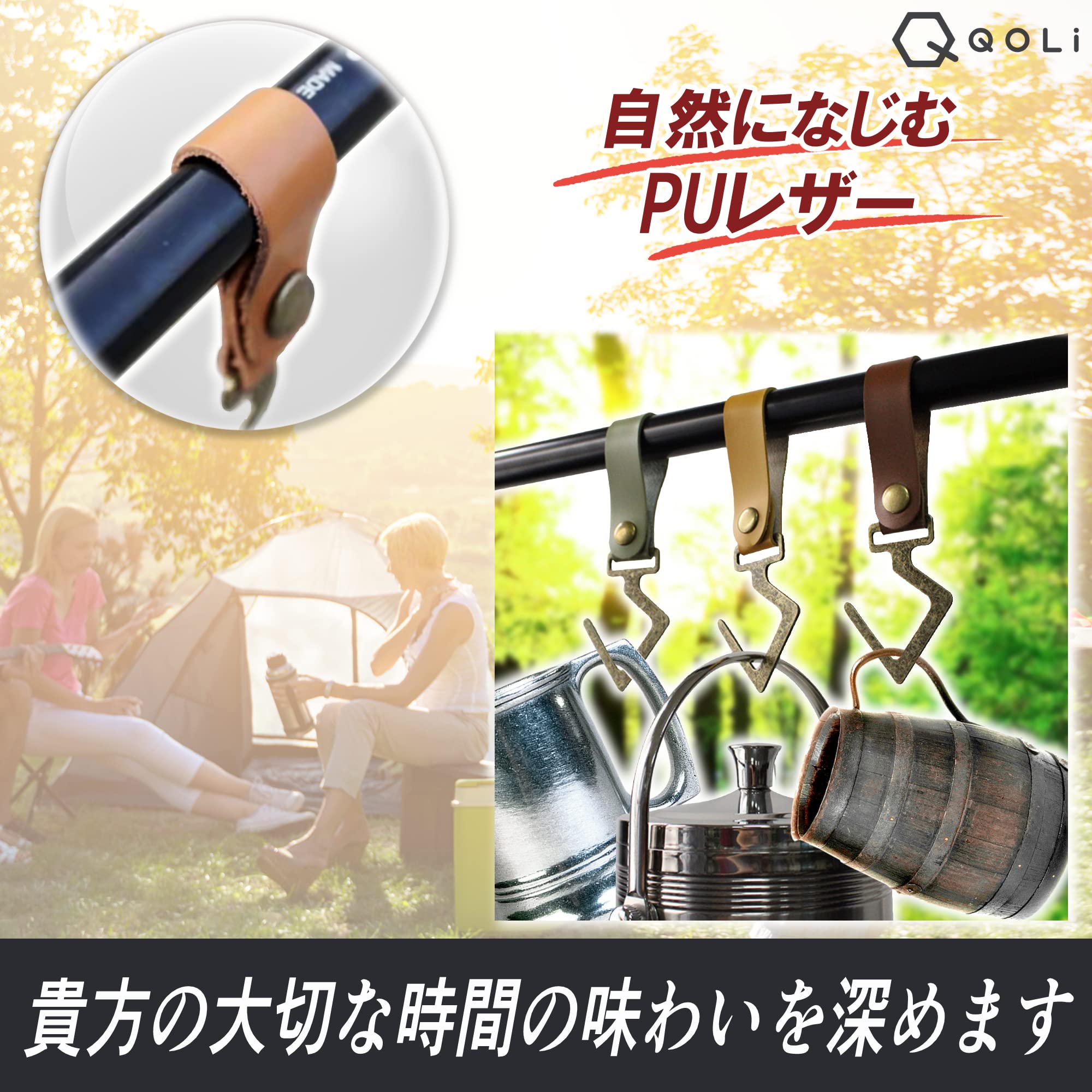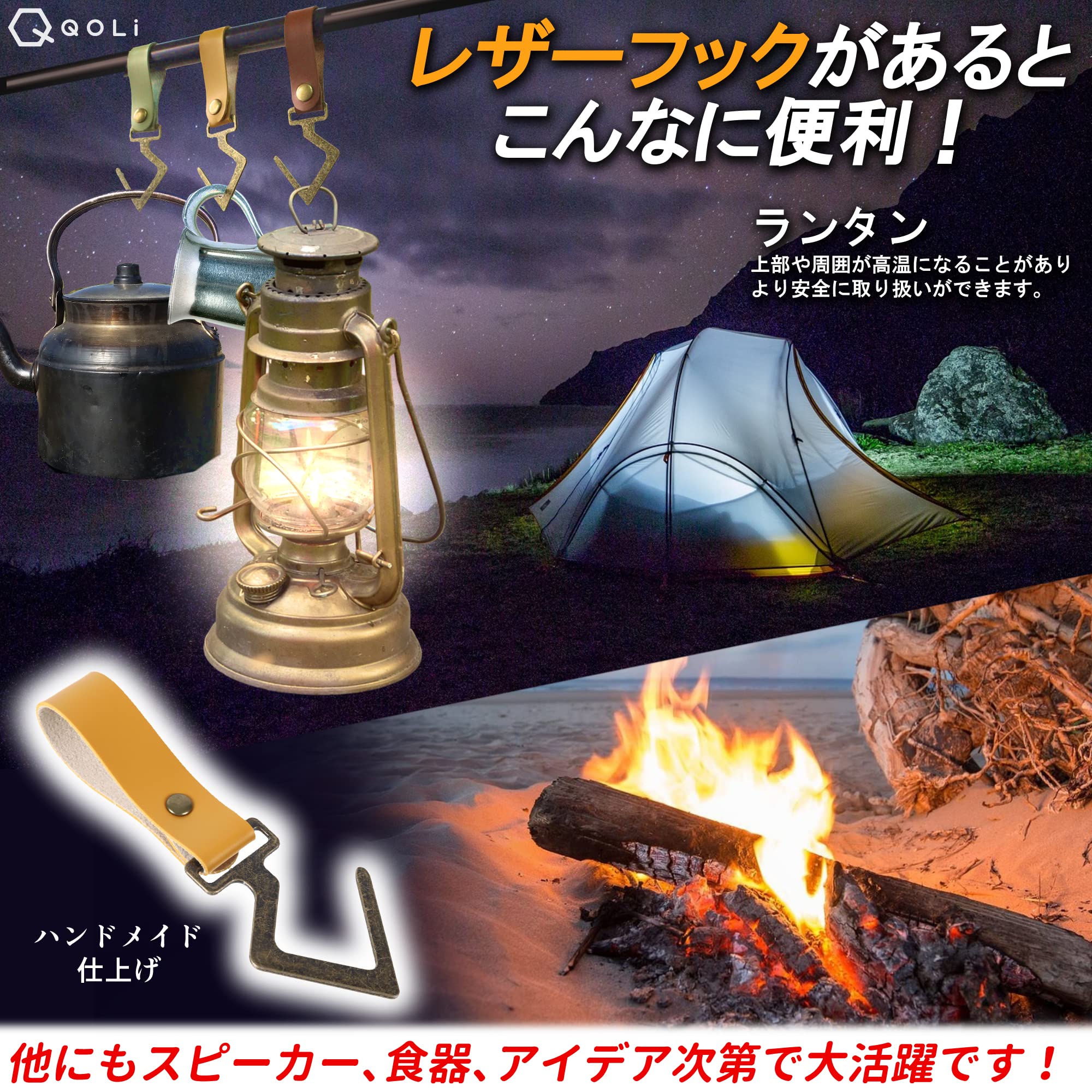 PUレザー製 ランタンフック【豊富なカラーバリエーションでワンランク上のアウトドアライフを♪】QOLiではキャンパー達に聞き取りを実施し、様々な状況を想定して商品開発をいたしました。PUレザーランタンフックをお使いいただき、上質なアウトドアライフをお楽しみいただければ幸いです。