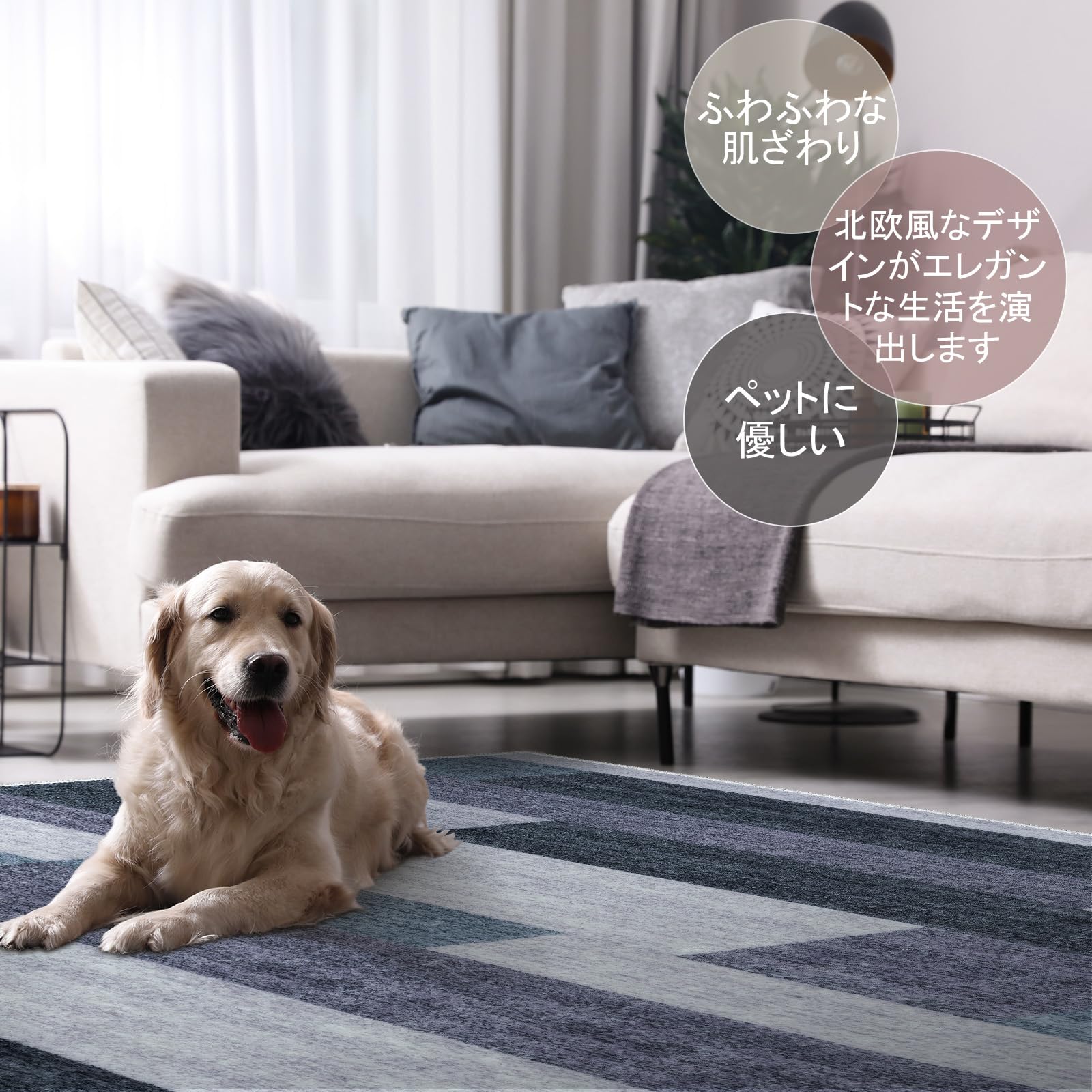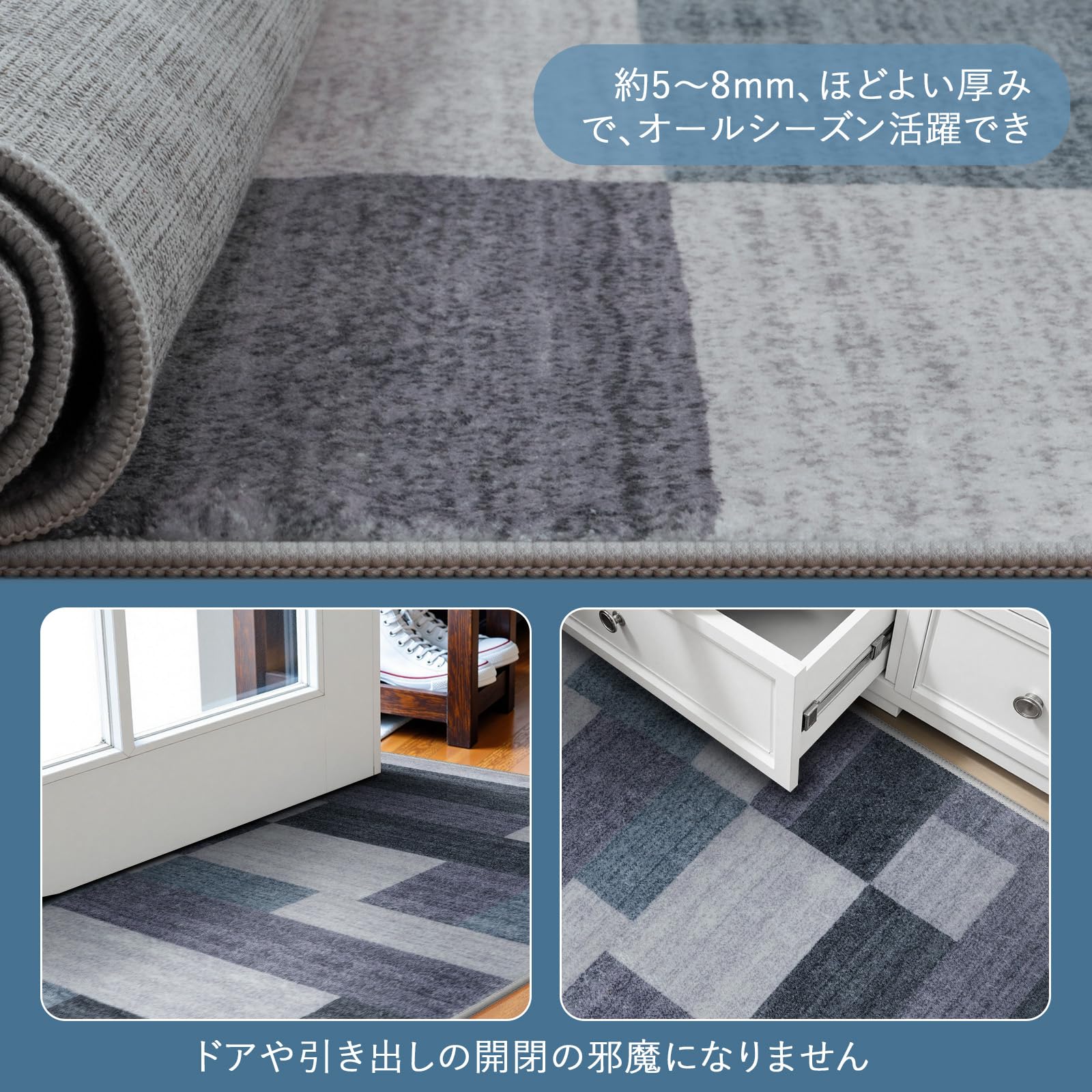 【幅広く活躍】ラグは機械織り製造で、丈夫で破れにくく、床を保護すると同時にインテリアとしても活用できま す。端縁にはオーバーロックの加工を施し、遊び毛が出たり、形を崩れたりしにくく、優れた耐久性を実現 します。また、ほどよい厚さで、オールシーズンお使いできます。ベッドサイド、リビングルーム、ベランダ、やダイニングの テーブルの下など様々なシーンで活躍します