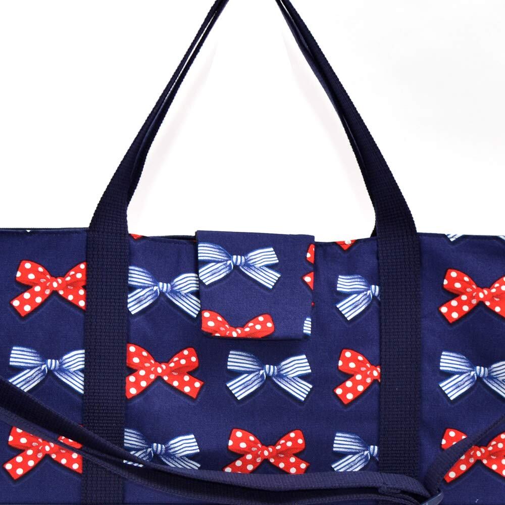 落ち着いた紺地に、愛らしいフレンチリボンのモチーフがたくさん!キュートな赤のポルカドットと大人っぽいネイビーのストライプが抜群の相性。少し大人っぽい雰囲気に。