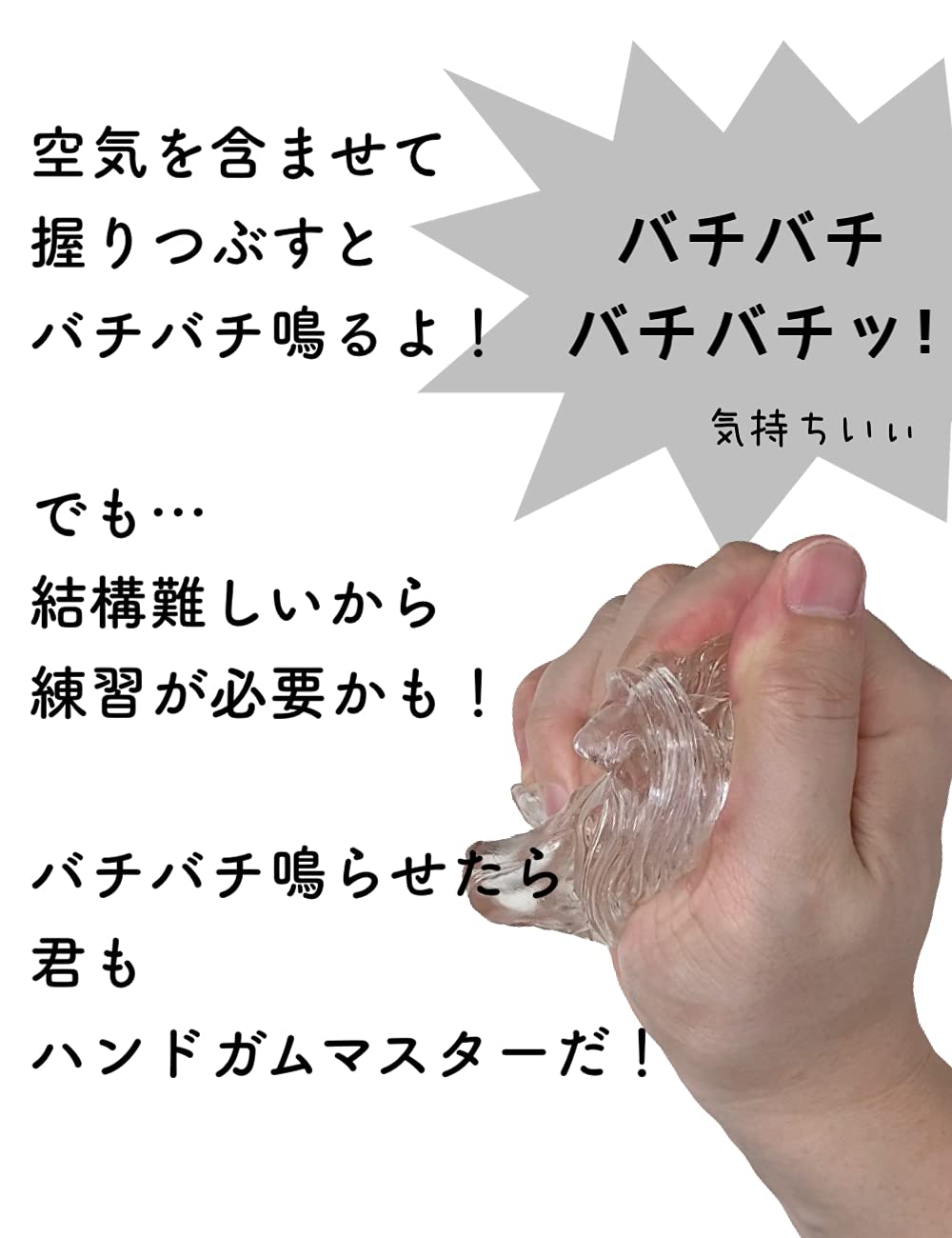 あなたはハンドガムスライムを触ったことがありますか?少し硬めな不思議な感触! 伸ばすと透明なハンドガムが銀色に輝きます。空気を含ませて強く握るとバチバチ音が鳴ります。 それが最高に気持ち良い!でもそれにはちょっとコツがいります。あなたはバチバチ音を鳴らすことができるでしょうか? 繰り返し使用しているとホコリや手の汚れにより濁る場合がございますが品質に問題はございません。