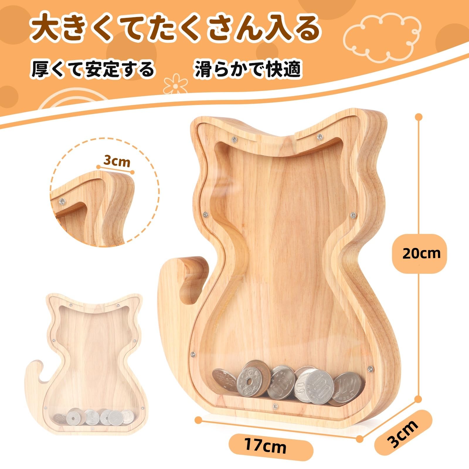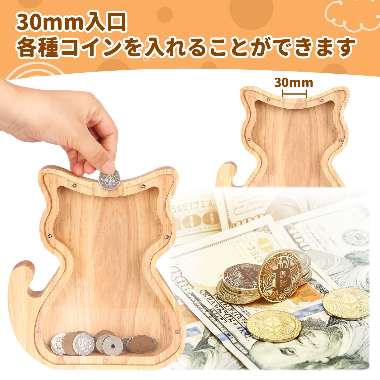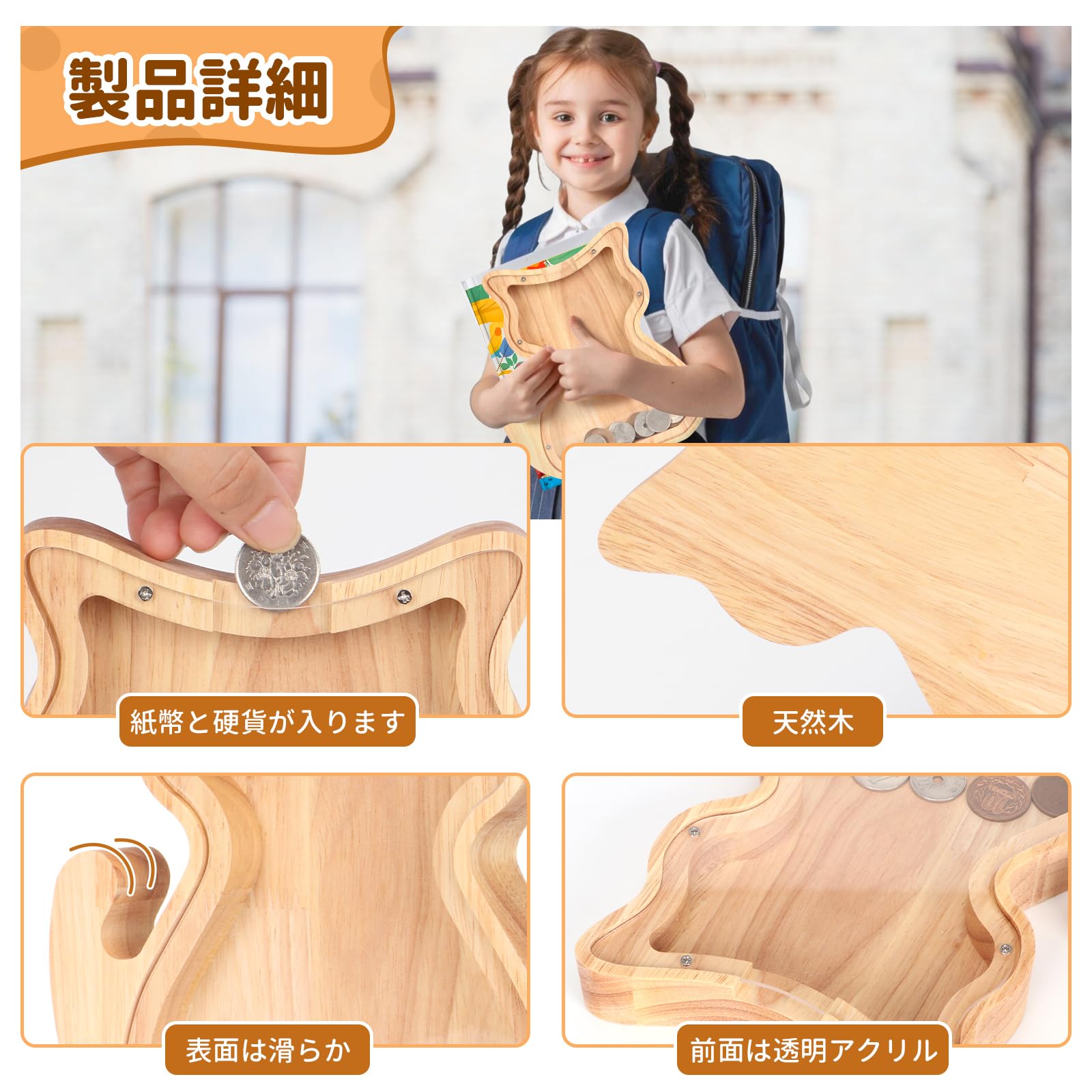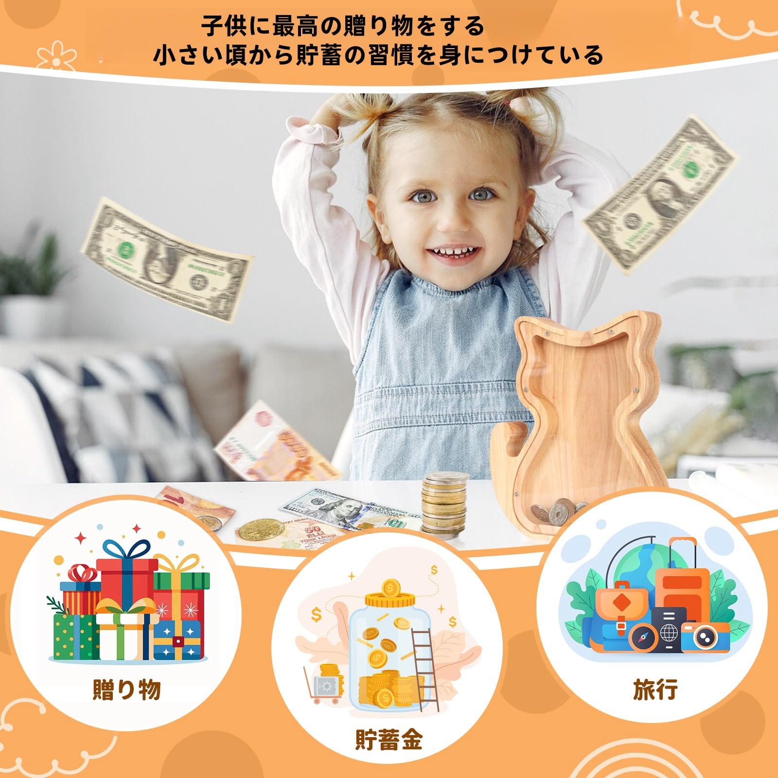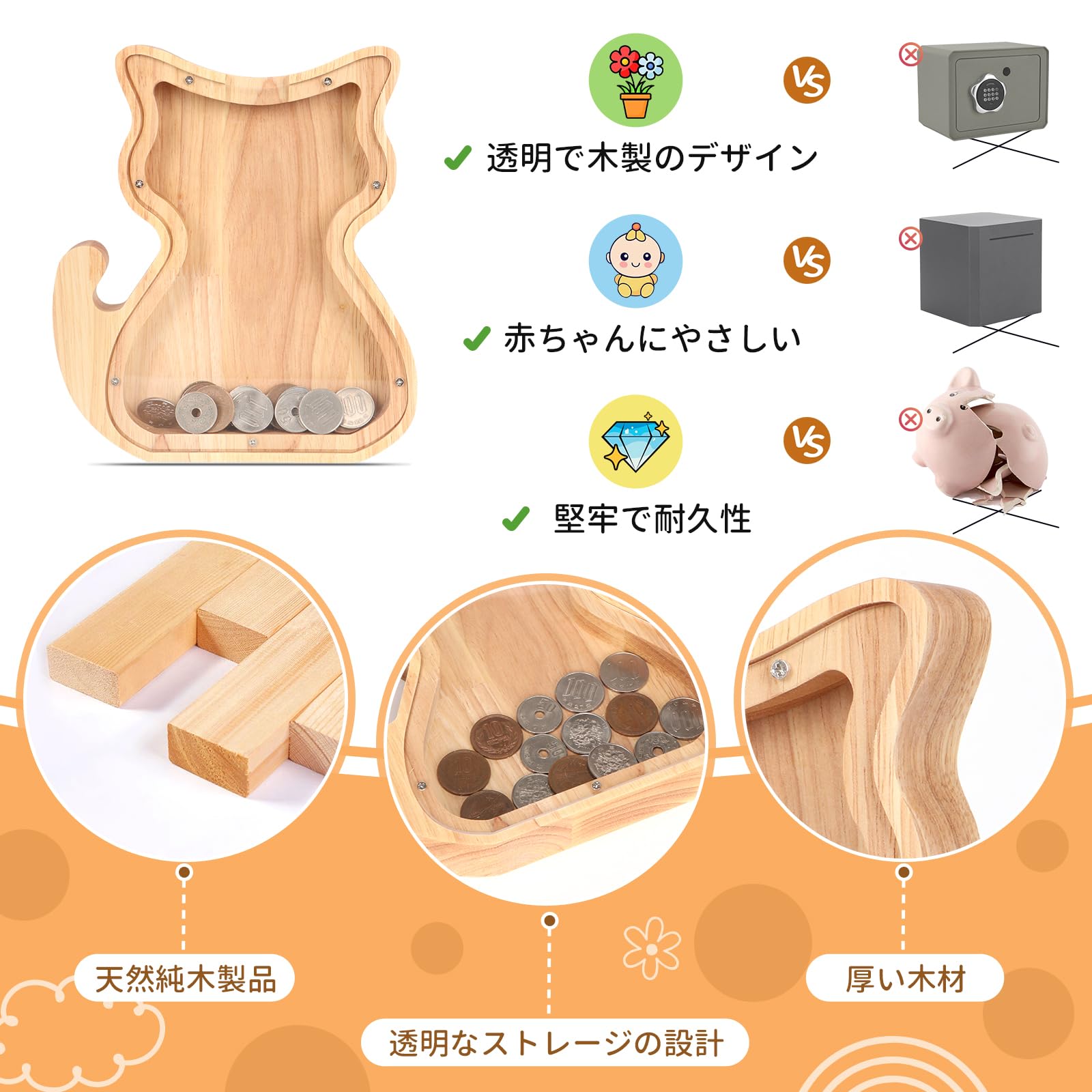 ?【高品質素材】当社の貯金箱は子供に優しくて厚手の無垢材で作りされており、安全で滑らかなエッジが特徴です。子供が何度も落としても壊れにくく、損傷しません。無垢材を採用して無公害、無ホルムアルデヒド、無臭気で、お子様へのプレゼントとしても安心してお使いいただけます。誕生日や入学祝いなどのプレゼントにも最適。実用的でありながら、遊び心を感じさせるアイテムは、贈り物としても喜ばれます。