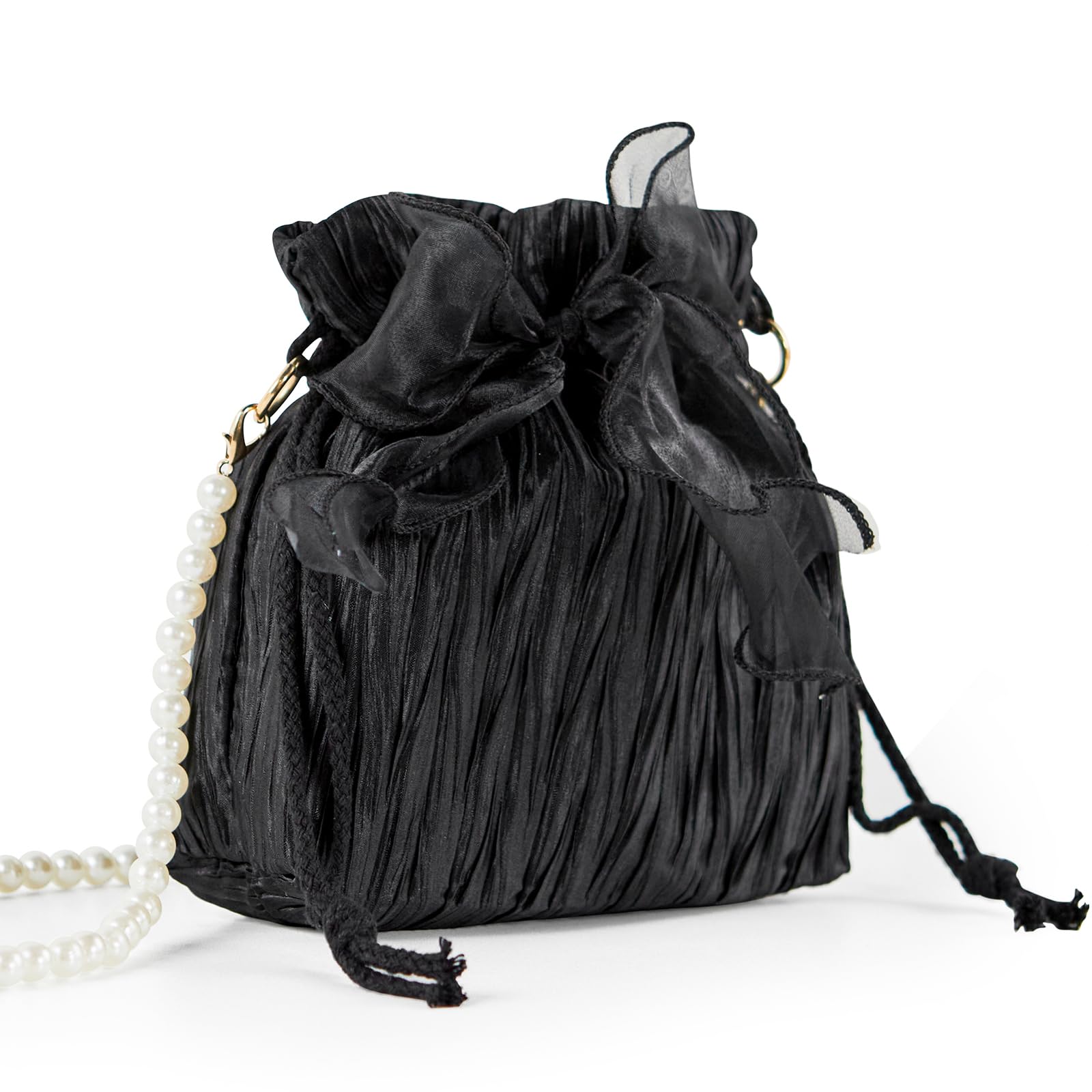 【上質な生地】シャーリング生地とパールのショルダーがとってもおしゃれな巾着バッグです。サイズ:横24cm×縦20cm×厚さ8cm。