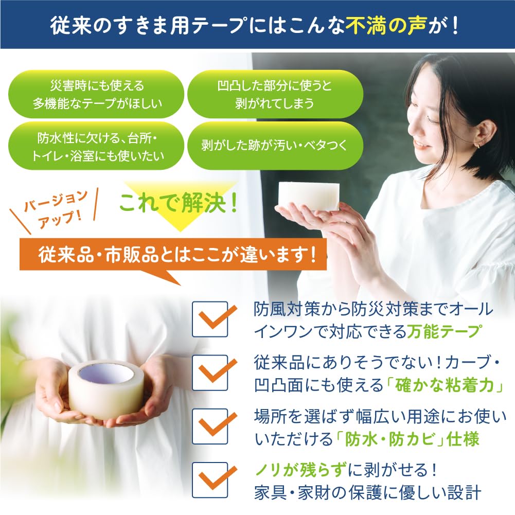 【現役防災士監修】「隙間風ふせーぐ」は、現役防災士山崎真優子氏監修のもと、窓・玄関・サッシ・ドア下・などの「すき間」を防ぐために開発された隙間風・防風に特化したテープです。ただ貼るだけのワンタッチ装着で、冷たいすきま風、花粉・土埃・害虫の侵入をブロック。ご家庭に1つあると、防風・防塵・防虫・防寒・断熱・花粉の軽減とオールシーズン役立ちます。
