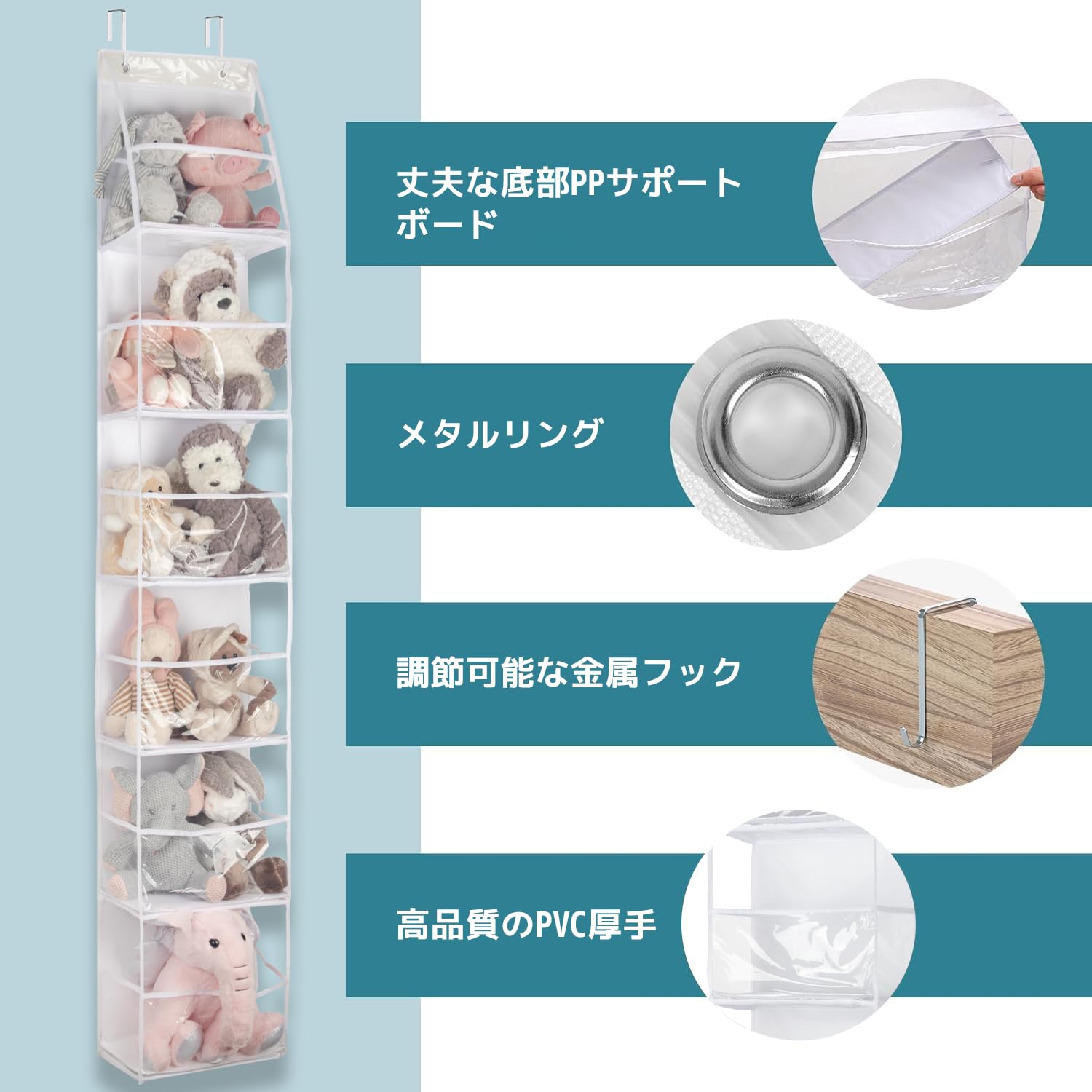 ?安全、高品質の素材?サイズ: 160*30*15cm。当社のドア掛けぬいぐるみ収納は、完全に透明なPVC素材で作られています。防水、無臭、無毒、すべて安全です。省スペース、広々とした収納と整理スペース、家のほぼすべての部屋に適しています。