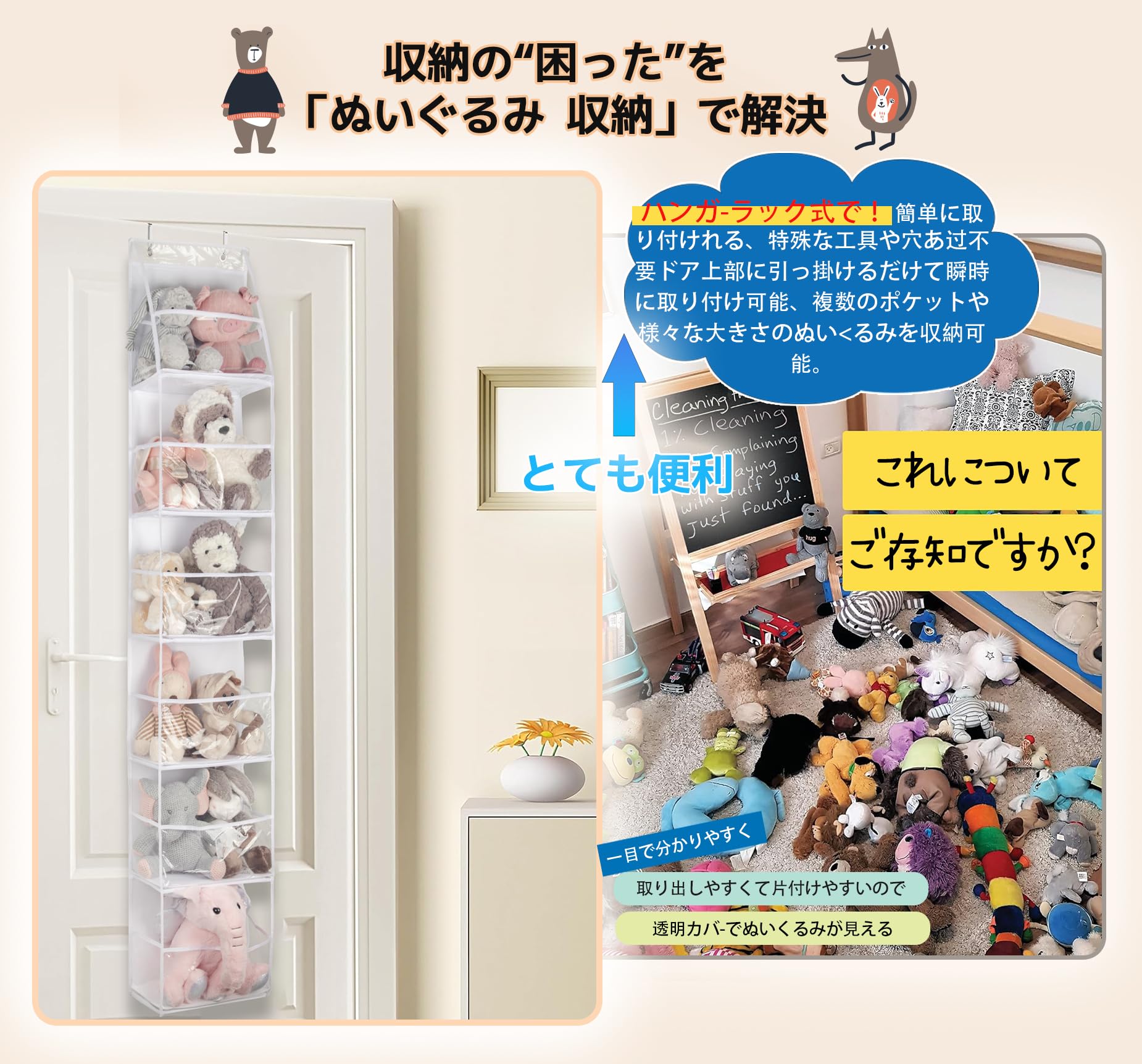 ?組み立て簡単?難しい組み立てが怖いですか? 心配しないでください。当社のドア掛けぬいぐるみ収納は素早く組み立てられます。ドアにフックを掛け、ぬいぐるみ収納をフックに掛け、底の段ボール 6 枚を挿入するだけです。
