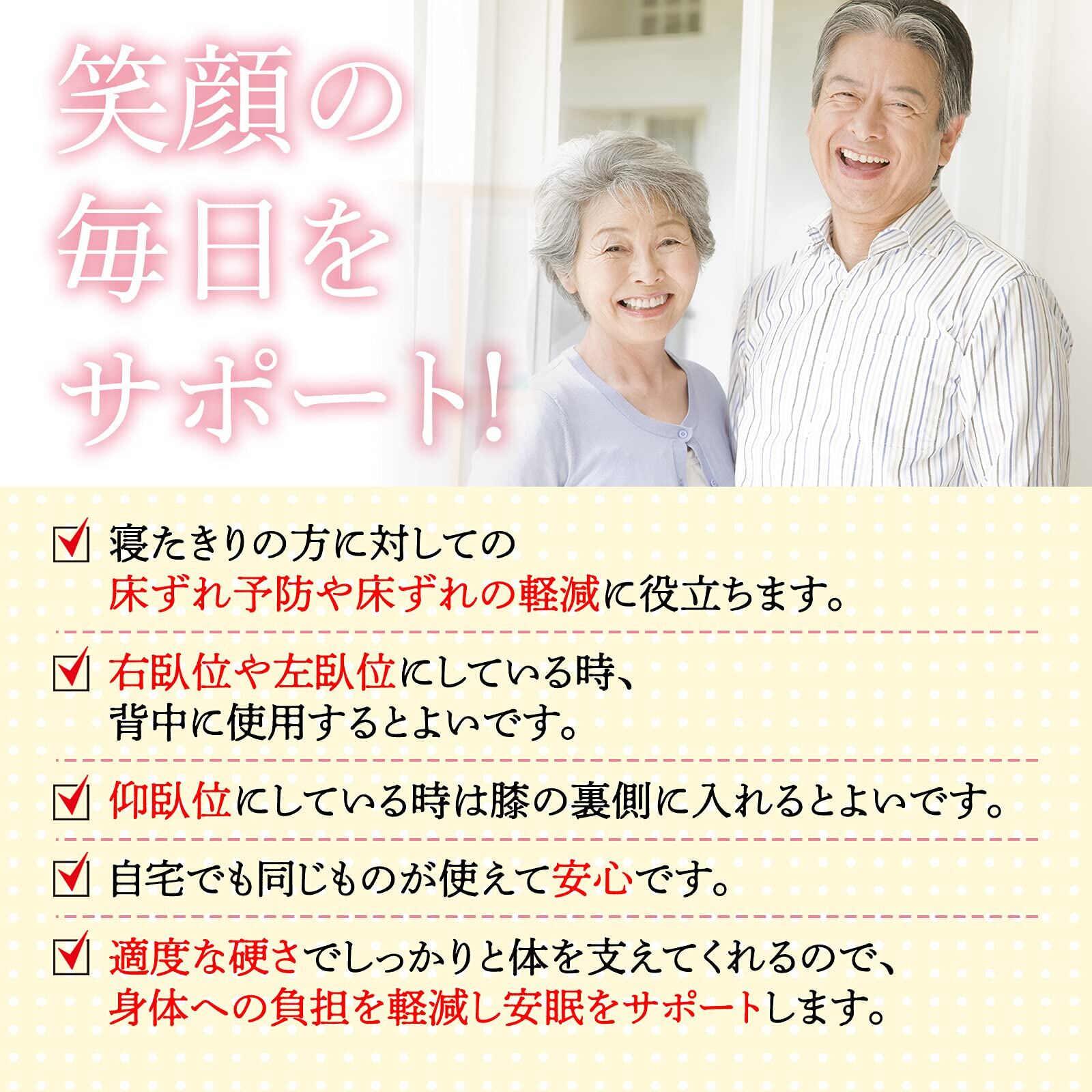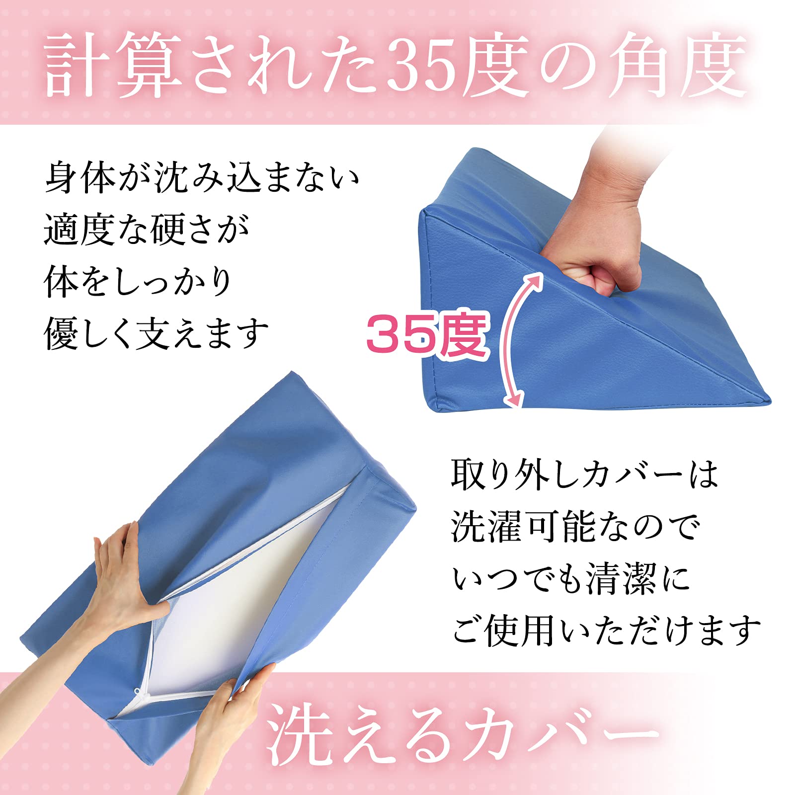 【高反発】弾力性に優れながら、身体が沈み込まない適度な硬さでしっかりと支えます。計算された斜めの角度35度で体の曲線に合わせて体勢をキープでき、側臥位・仰臥位時の除圧、足上げ、寝返りの介助をスムーズに。身体への負担も軽くなります♪ 【洗えるカバー】カバーはファスナーを開けてサッと取り外しでき、洗濯が可能なのでいつでも清潔にお使いいただけます。肌の弱い方やあせもなどの皮膚トラブルが気になる方にピッタリ!万が一汚れてしまったときも安心です。