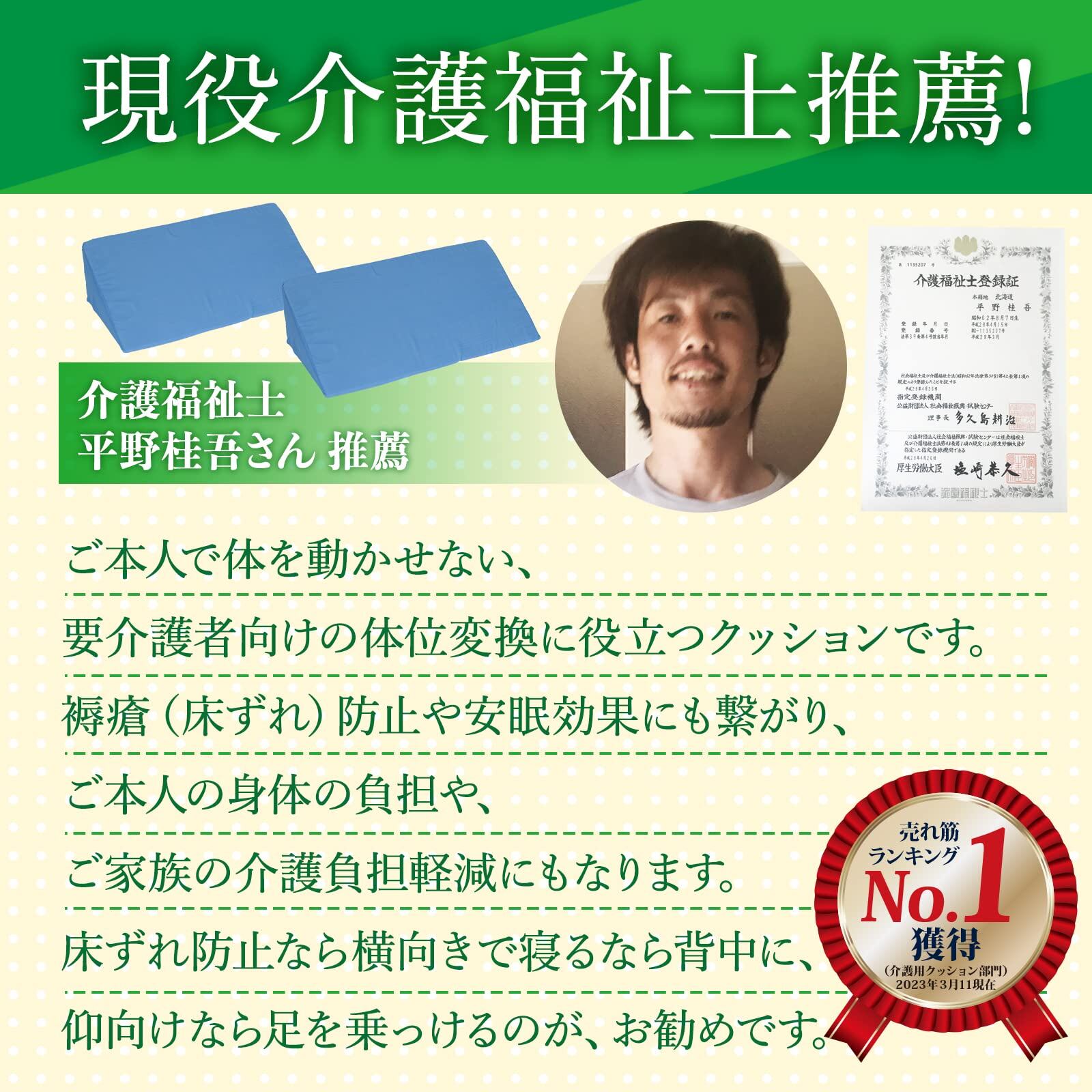 【介護福祉士推薦!三角クッション2個セット】寝返りができない方の体位変換や足の挙上、姿勢保持を補助し、褥瘡(床ずれ)の予防や安眠をサポート。適度な硬さで35度側臥位で体を支える事が出来るので身体の移動を助け、介助がしやすくなる便利なアイテムです。要介護者の方も介護福祉施設で働くヘルパーさんや体が不自由な高齢者を在宅介護しているご家族の介護者の方も負担の軽減が出来、双方嬉しい商品となっています。