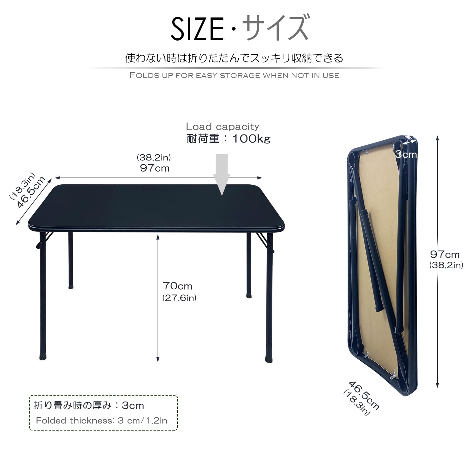 【折りたたんで省スペースタイプ】テーブル展開サイズ:97D×46.5W×70H cm。必要な時にパッと広げて、用が済んだらサッとたたんで収納できます。折りたたみ時のデスク厚さは3cmになるため、場所をとらずお部屋を広く保てます。