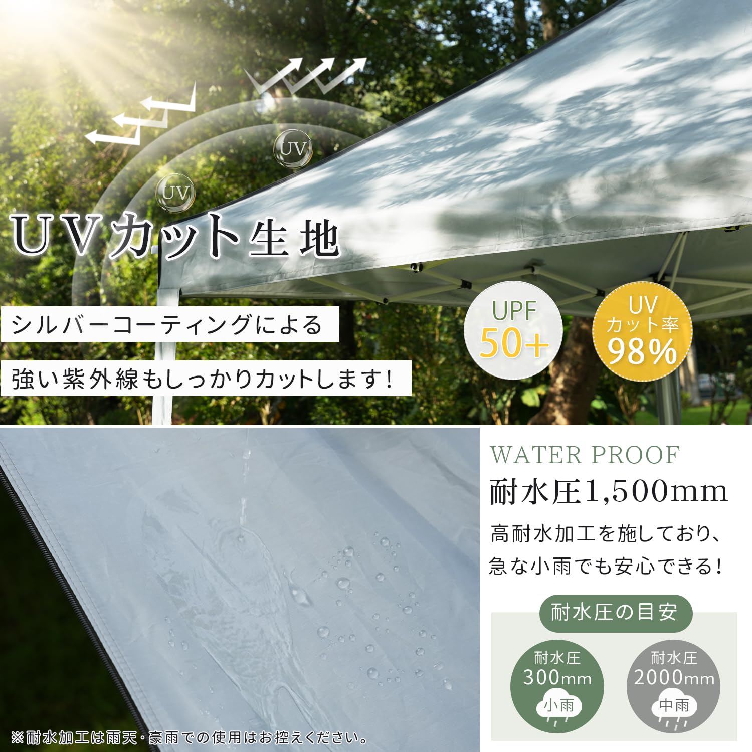 【耐久性高い素材】①太く、厚みのあるステンレス製フレームで構造も安定し、防錆加工をしており、長くお使いいただけます。②高品質なUV加工&高耐水加工をした210Dオックスフォードを採用し、強い紫外線をしっかりガードできるし、突然の小雨でも心配いりません。(雨天での使用お控えください)