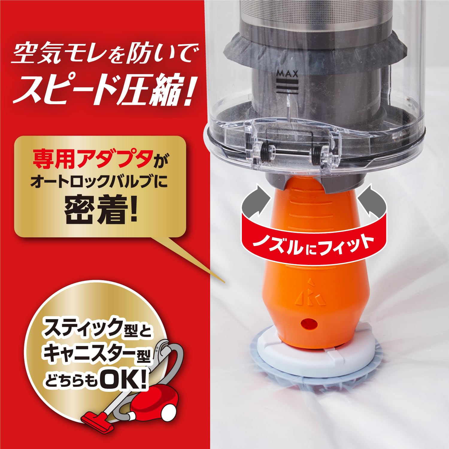 ・スピード圧縮できるアダプタ付き 空気をしっかり吸引できるバルブにピッタリサイズのアダプタを開発