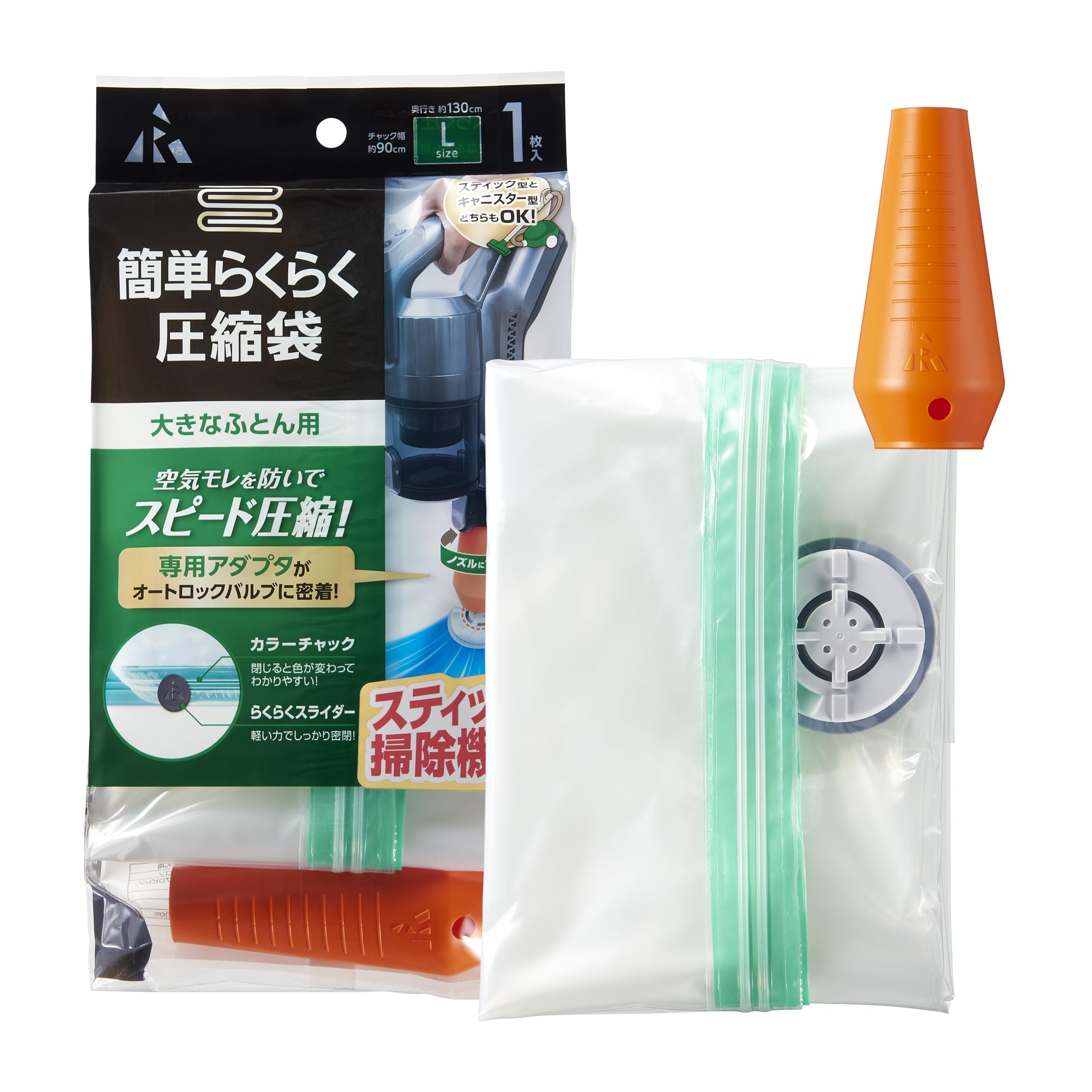 【特価在庫】アール(R) 簡単らくらく圧縮袋大きなふとん用1P 圧縮袋 透明無地 90×130(cm) アダプタ付き バルブ式 スティック型 キャニスター型 KR-002