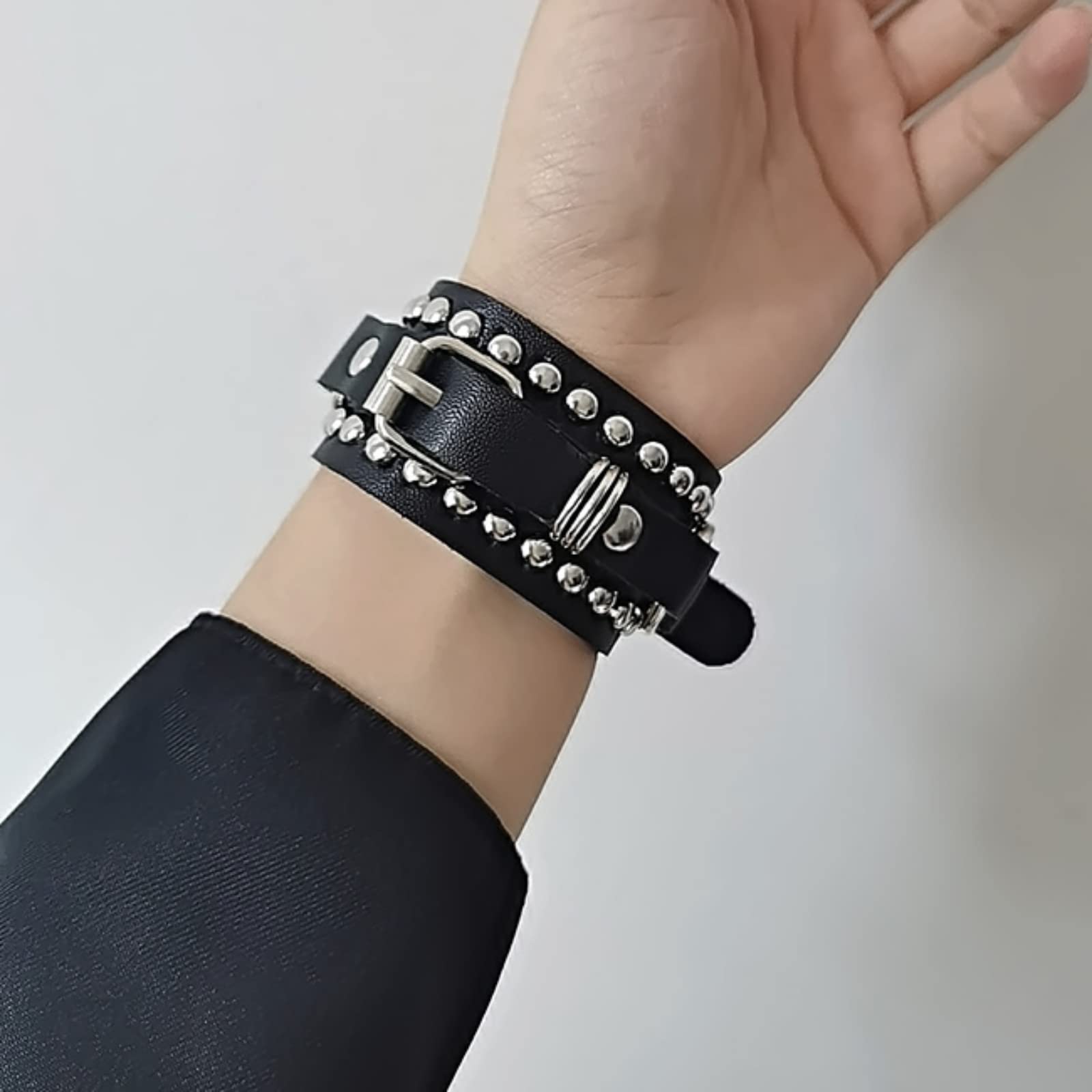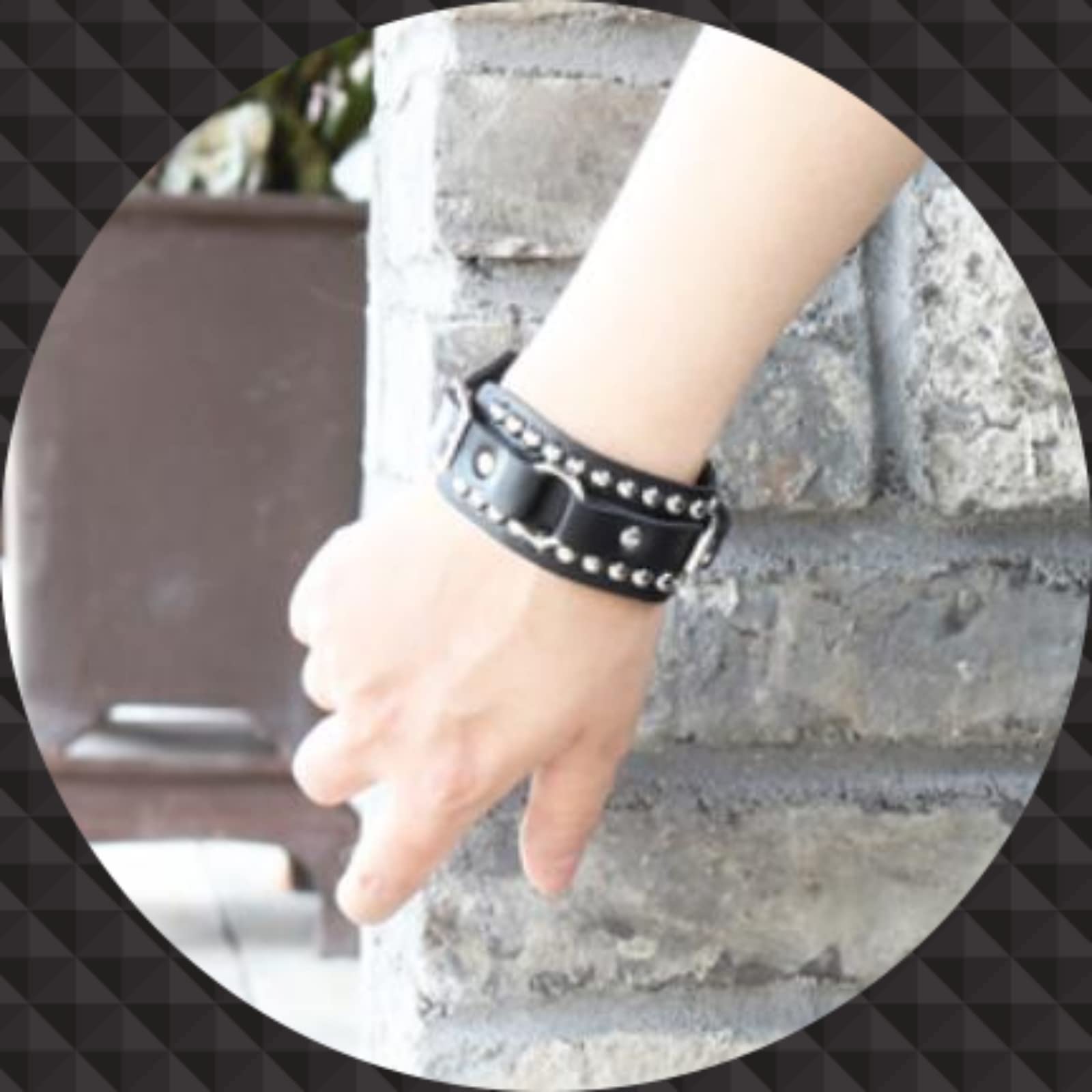 軽量で着け心地のいいスタッズブレスレットは4つのベルト穴があるので長さの調整が可能。 直接手首に巻くのはもちろん、服の上からも着用OK!その日のシチュエーションに合わせて取り付けを楽しんで下さい。 手首に取り付けるだけでも気分も上がる!ハードめなブレスレットです。男女兼用!