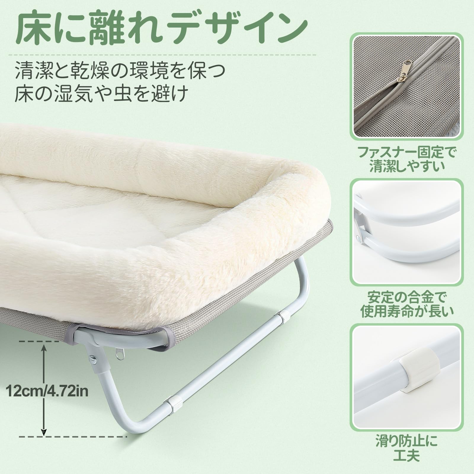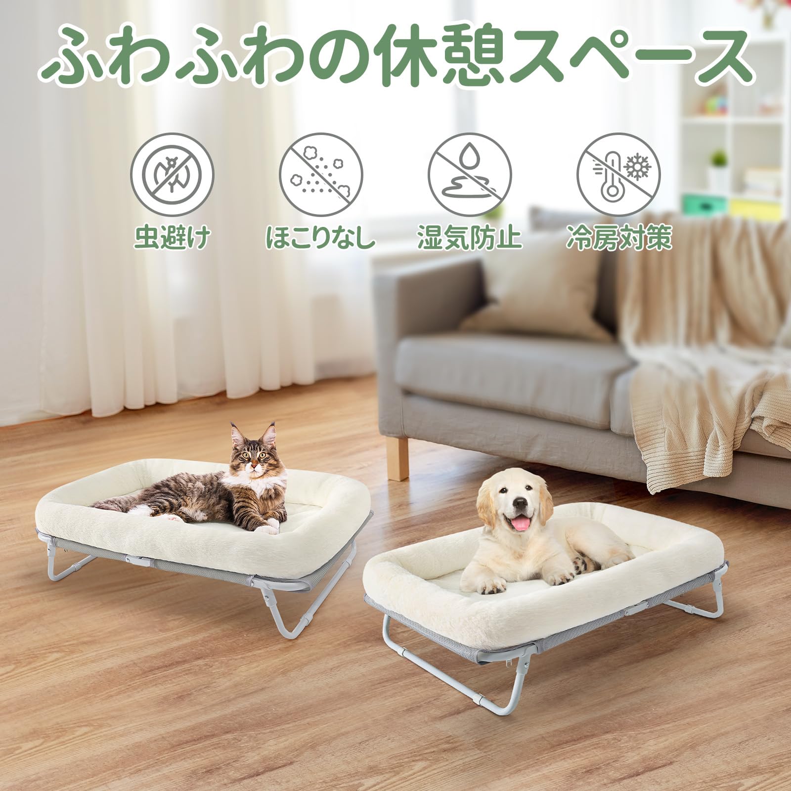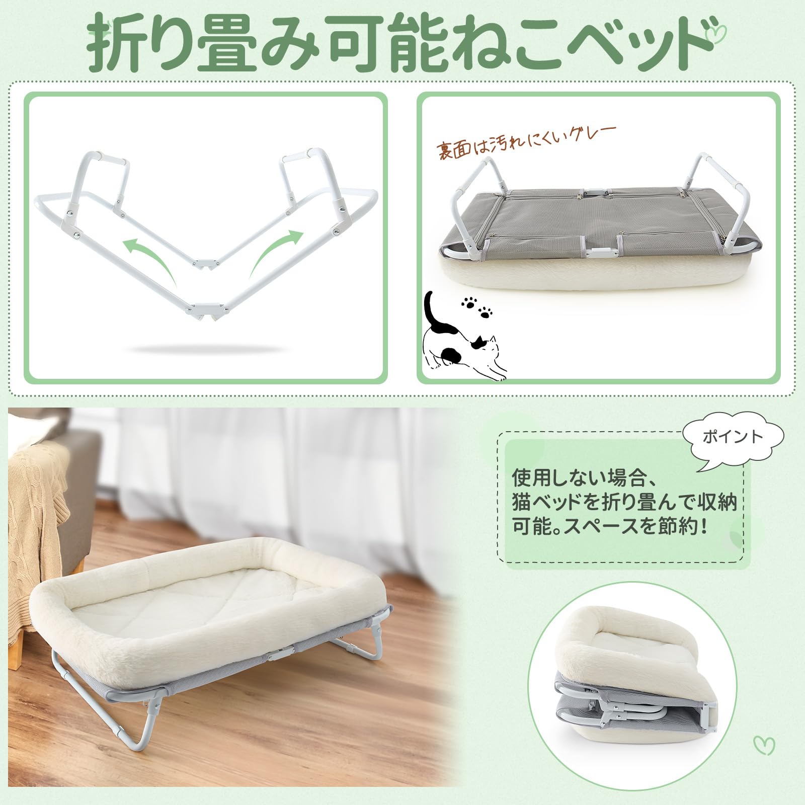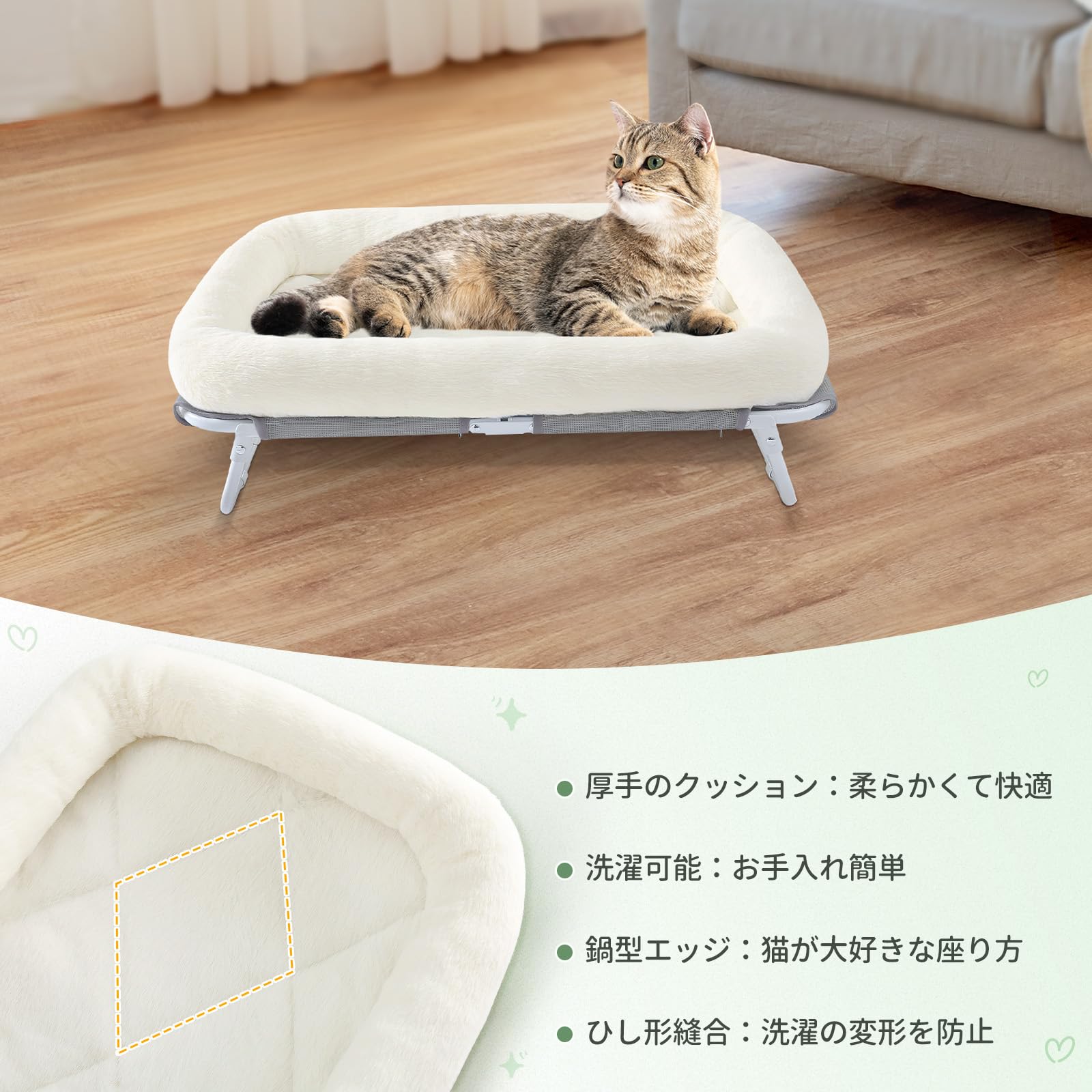 【快適な寝心地】ふわふわなクッションがある程度で体を包み込むような安心感をニャンコに与え。フランネル素材で冬には暖かい、夏には冷房対策になります。1年間快適に過ごせます。床から10cm離れて、虫やほこりの対策になります。湿気や寒気の溜まりの恐れもありません。