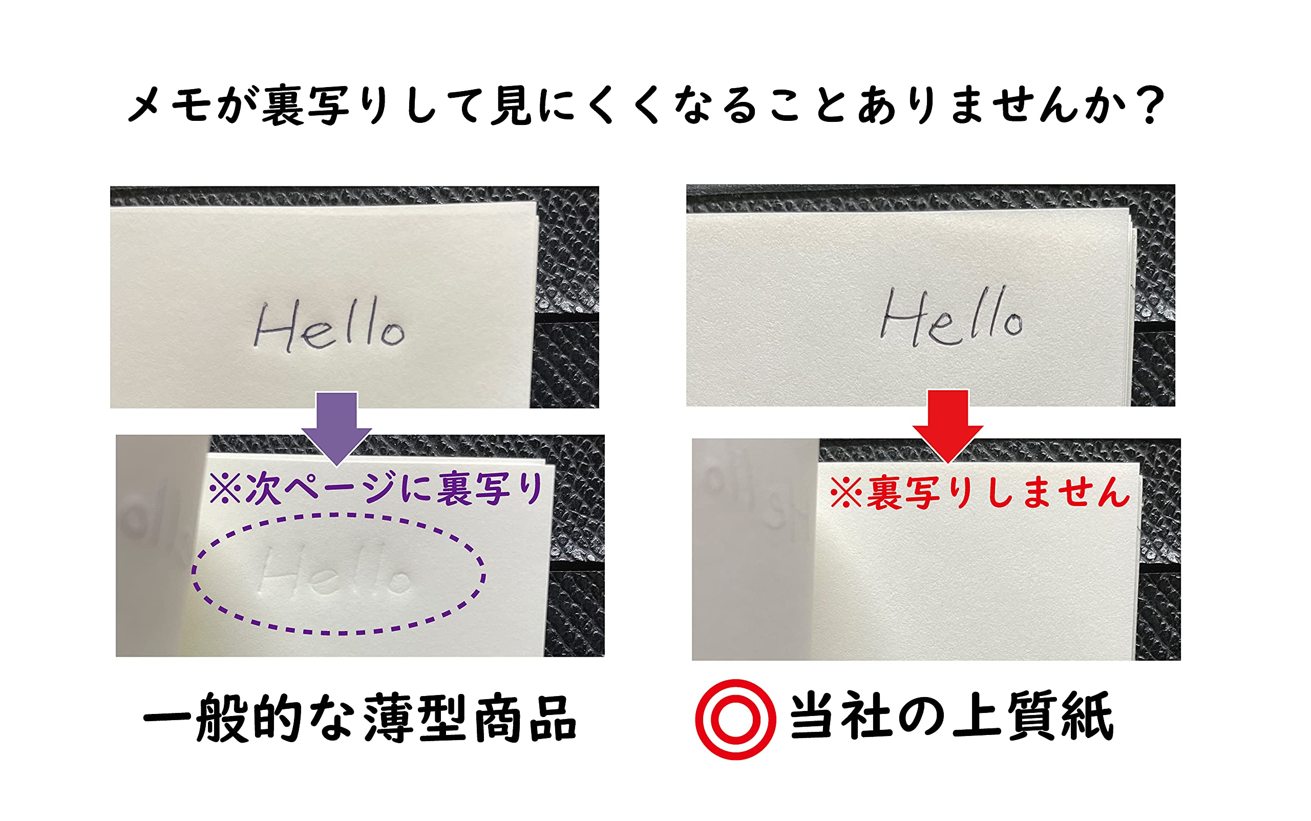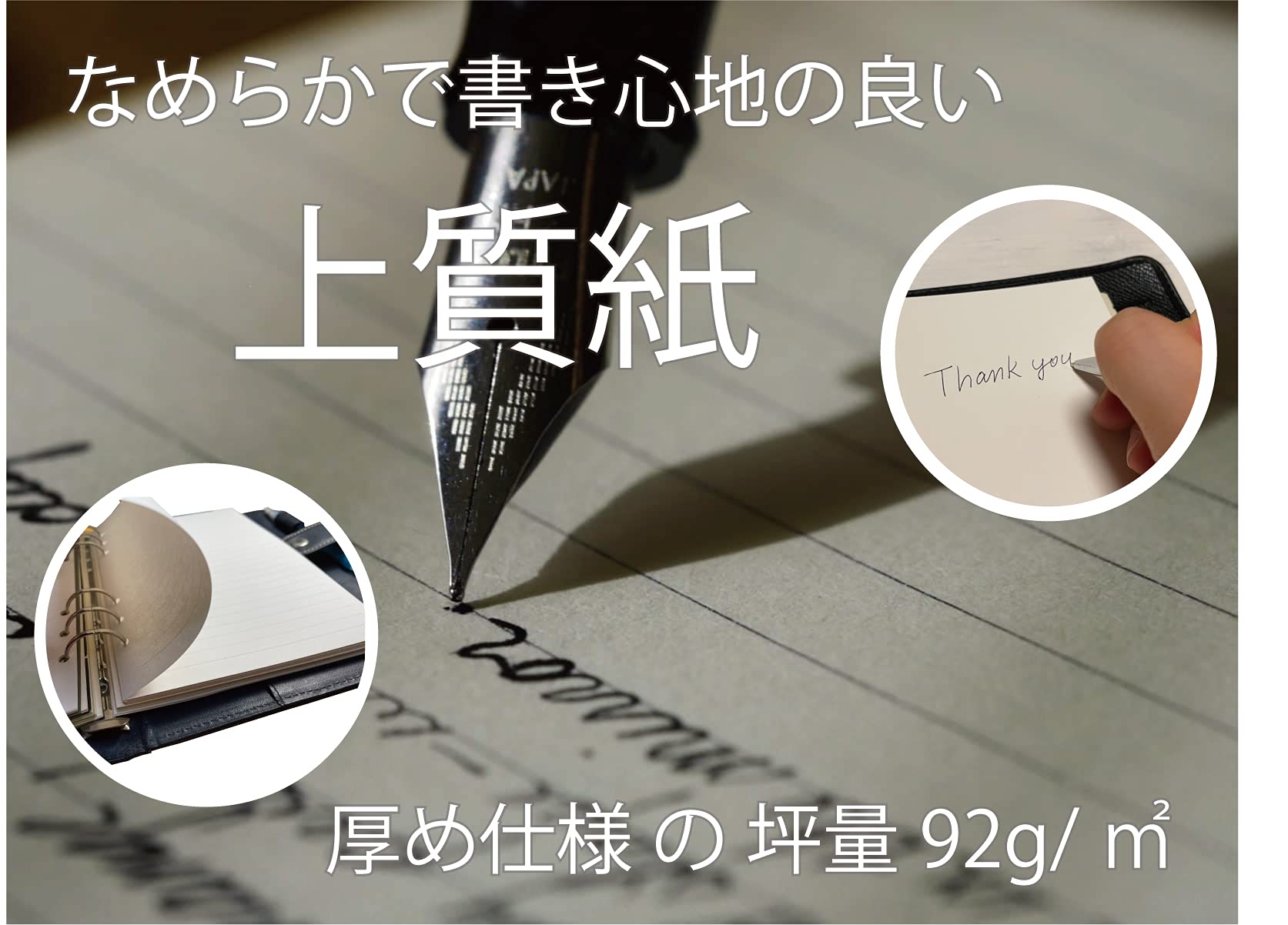 ??厚めの上質紙(92g/㎡)で書き心地抜群です。下敷きを敷かなくても次ページへ裏写りせず、インク滲みもしにくい仕様。