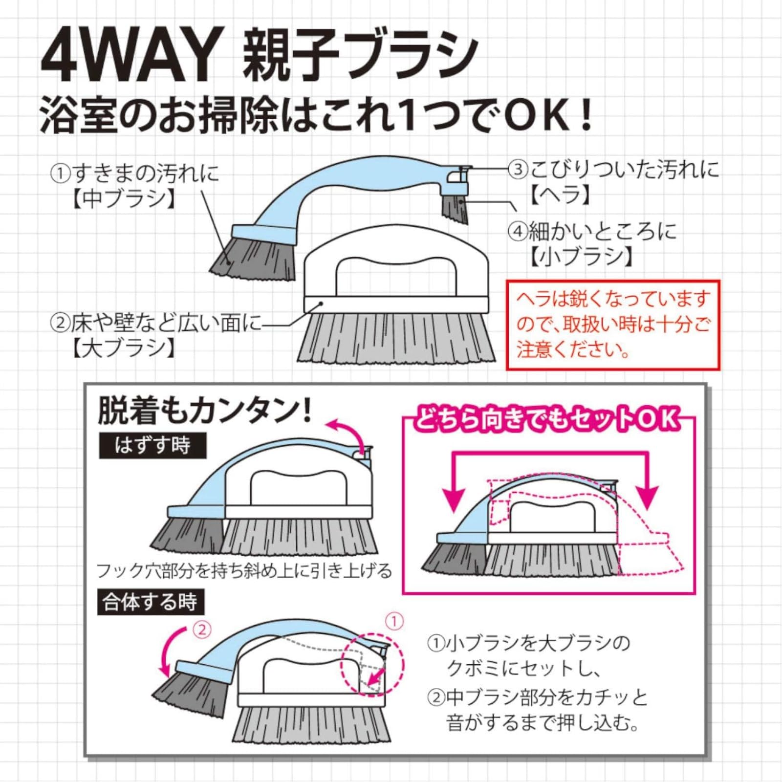 ●1つで、浴室のいろんな場所をお掃除できる便利な4WAY親子ブラシ。