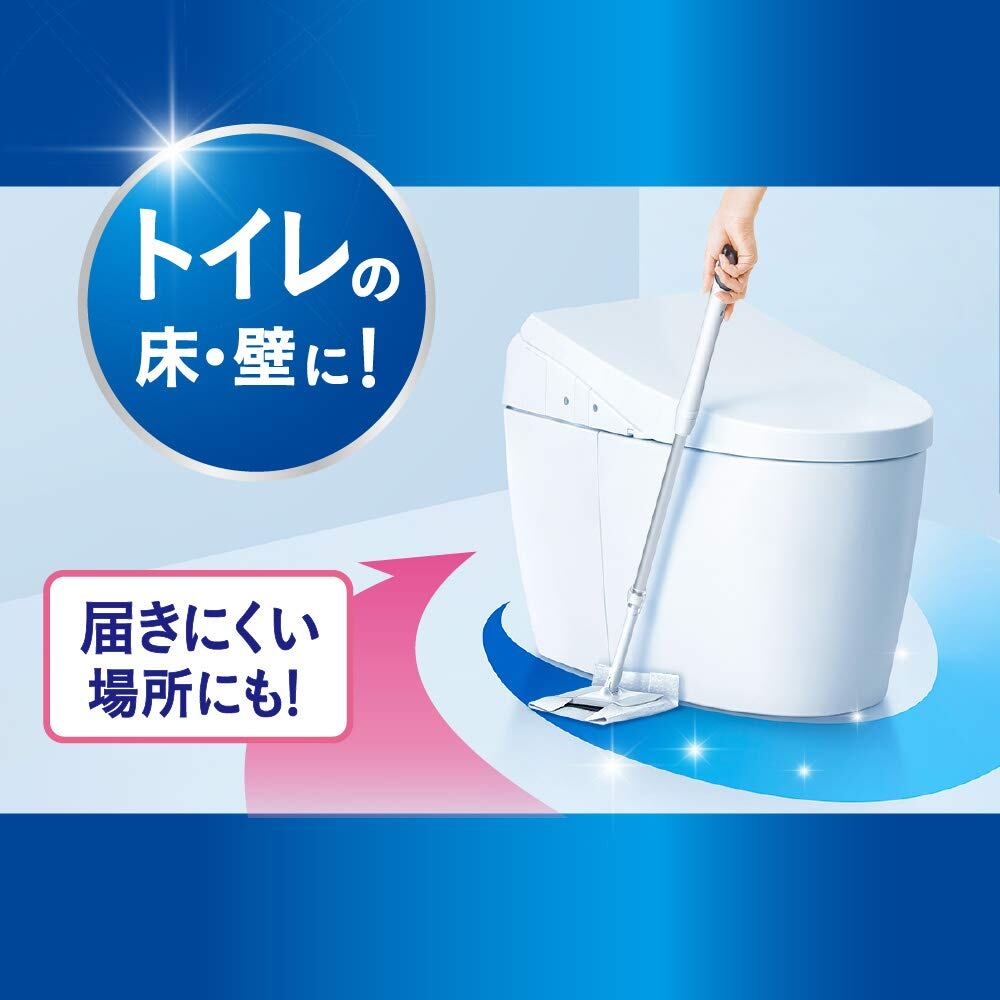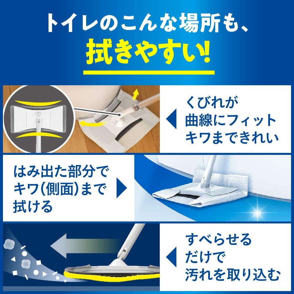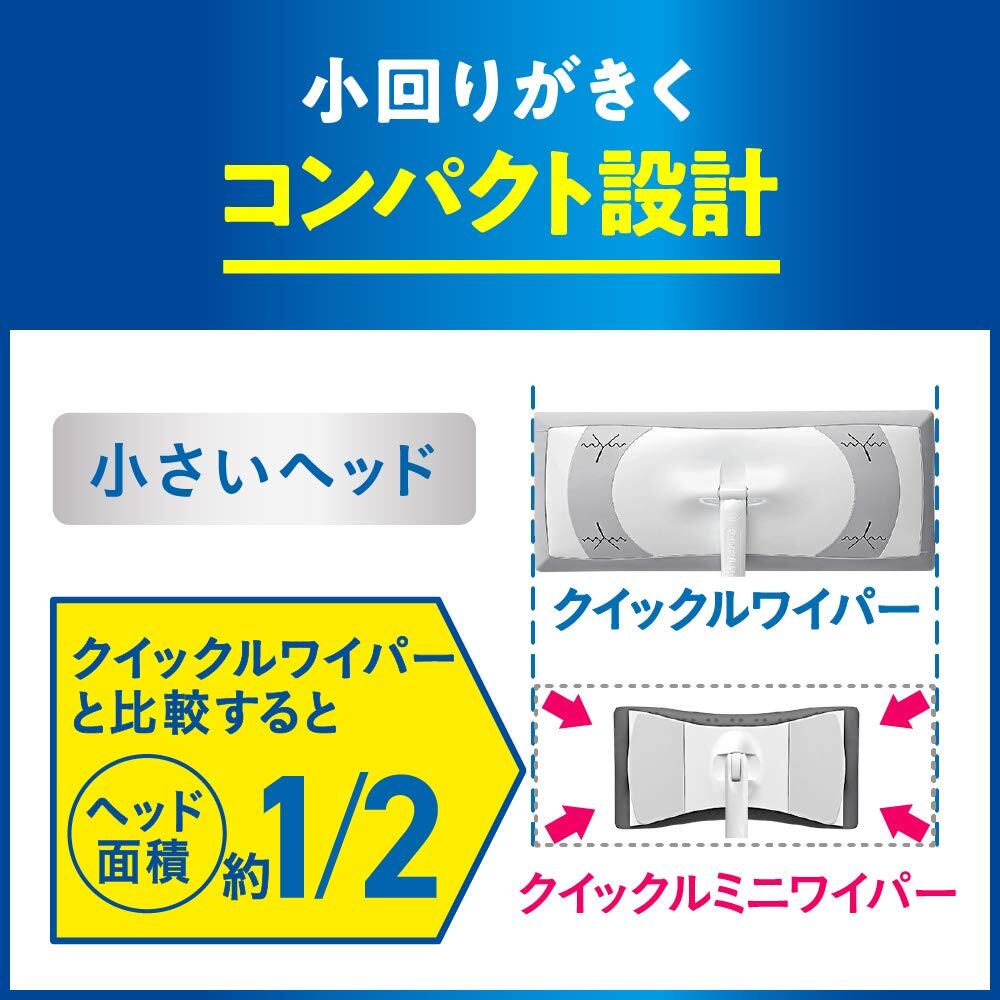 ●ヘッドはクイックルワイパーの1/2サイズ、柄の長さは2/3の小回りがきくコンパクト設計だから、届きにくくておそうじが大変なトイレの床奥でもひざをつかずにラクに拭ける。