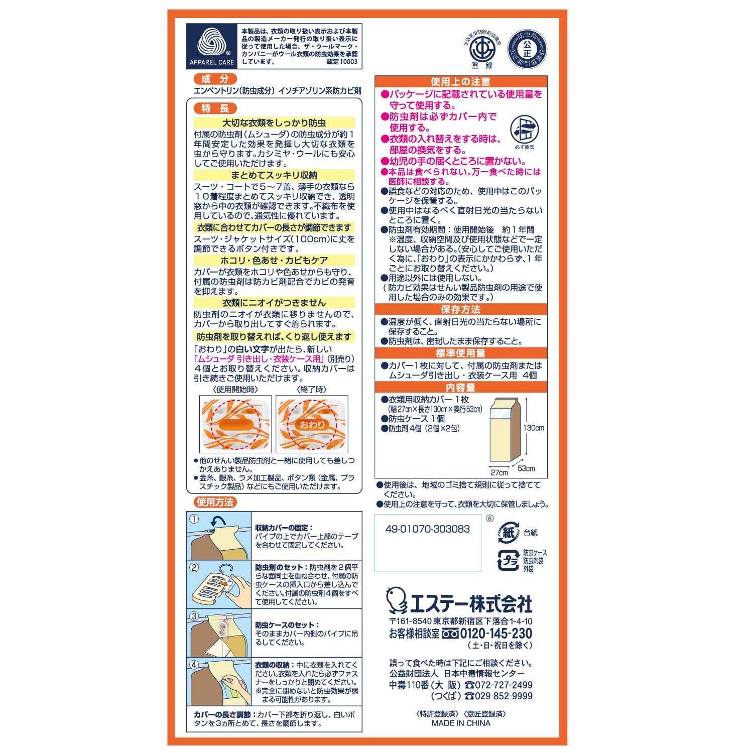 ●付属の防虫剤は1年間有効で、長期収納にも最適。