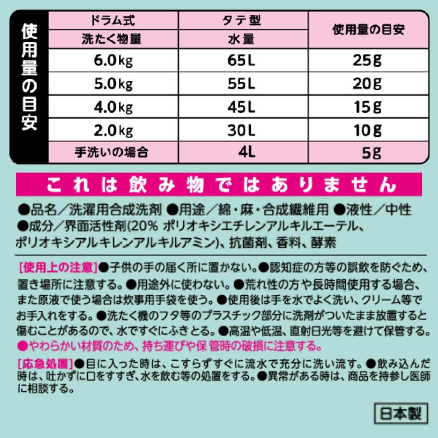 界面活性剤(20% ポリオキシエチレンアルキルエーテル、ポリオキシアルキレンアルキルアミン)、抗菌剤、香料、酵素