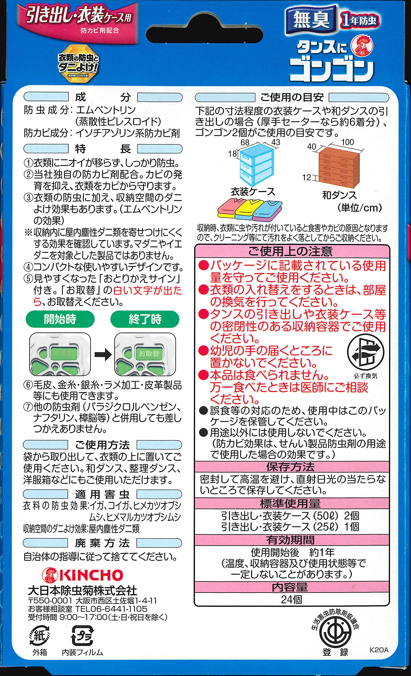 ●ご使用の目安…衣装ケース(幅43cm高さ18cm奥行68cm寸法程度)や和ダンス(幅100cm高さ12cm奥行40cm寸法程度)の引き出しの場合(厚手セーターなら約6着分)、ゴンゴン2個がご使用の目安です。収納時、衣類に虫や汚れが付いていると食害やカビの原因となりますので、クリーニング等にて汚れをよく落としてからご収納ください。引き出し(50L)2個、和服にご使用の場合は一番上のたとう紙の上に置いてください。衣装ケース(50L)2個、洋服ケース(25L)1個●保存方法…密封して高温を避け、直射日光の当たらないところで保存してください。