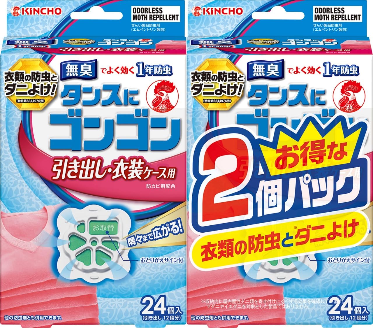 【数量限】タンスにゴンゴン 衣類の防虫剤 引き出し・衣装ケース用 24個入 無臭 2個パック (1年防虫 防カビ ダニよけ) タブレット