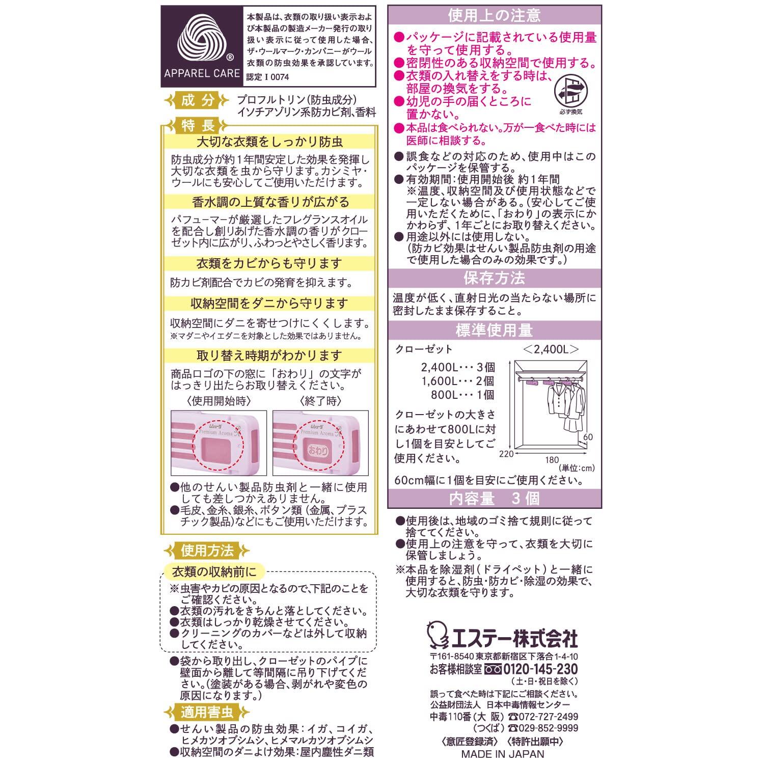 ●上質なフレグランスオイルが収納空間内にふわっと広がり1年間衣類を虫から守ります。●優美なフローラルフルーティの香りです。●取り替え時期がわかる、取り替えサイン付きです。●クローゼット用。