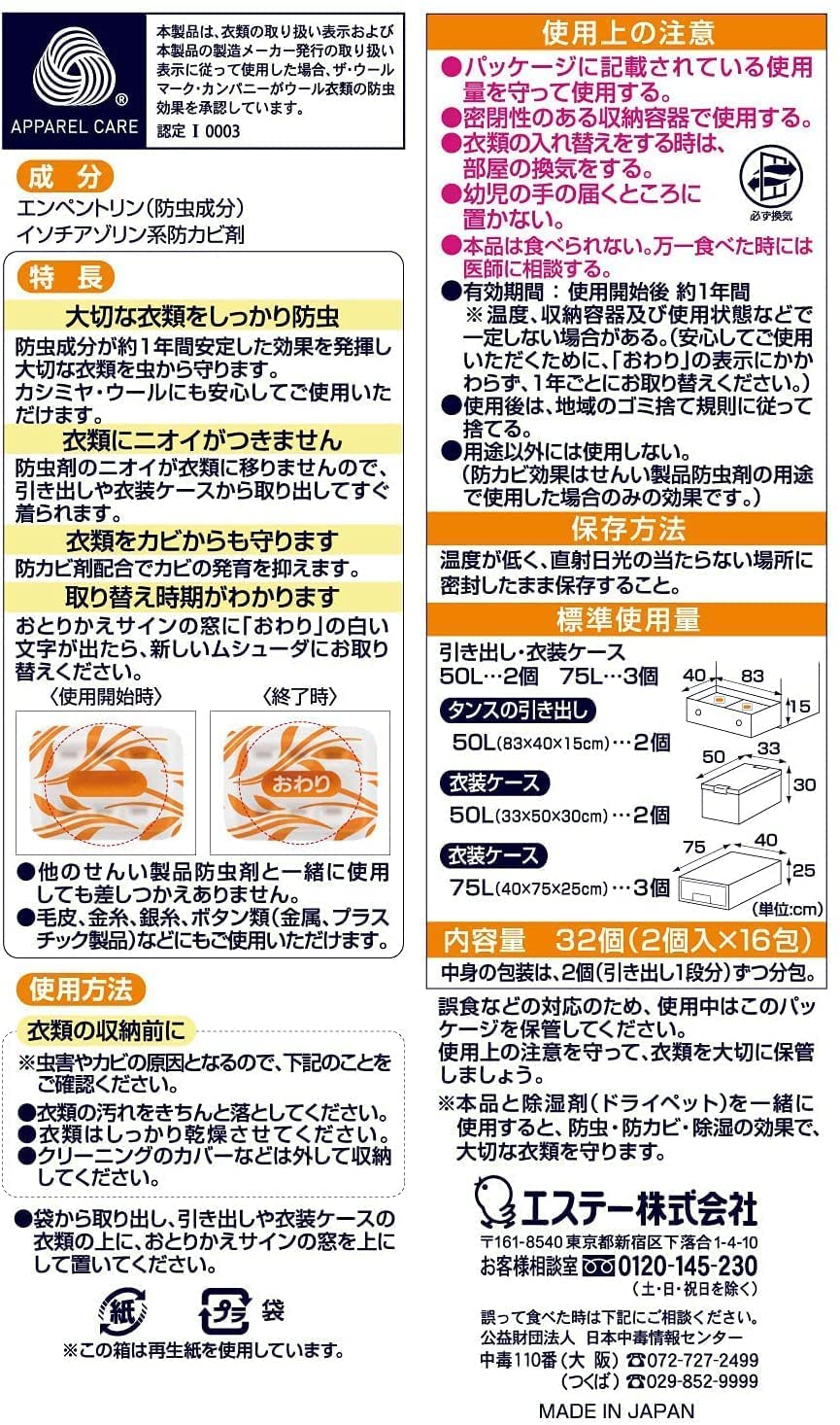 商品名:[エステー ムシューダ 1年間有効 引き出し・衣装ケース用 32個入 ] が