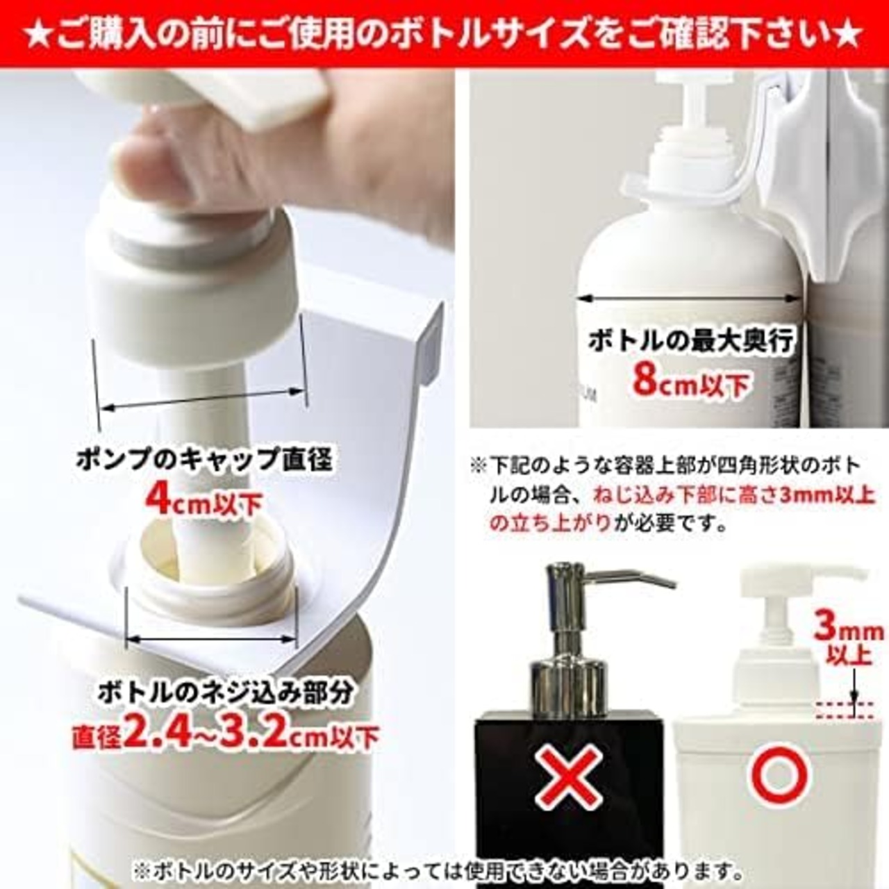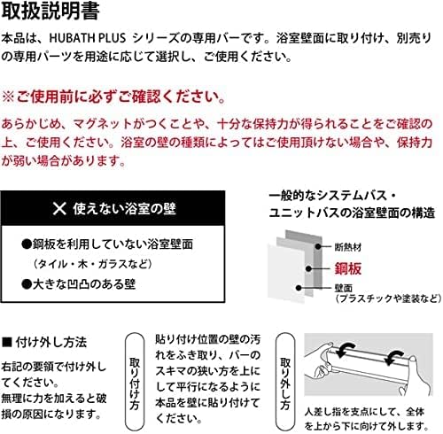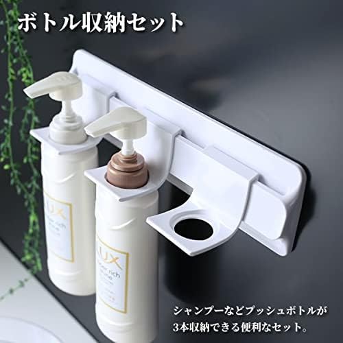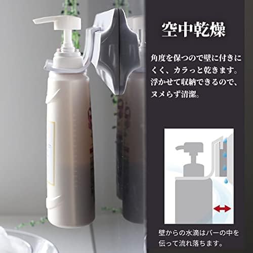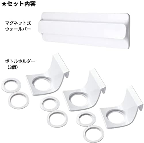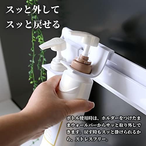 「浮かせる収納」で浴用品を清潔に収納。浴室の壁に取り付けるマグネット式のウォールバーと、専用パーツのボトルホルダーのセット。シャンプーやコンディショナーなど、ポンプ付きのボトルを吊るして収納できます。床はもちろん、壁にもつかない設計でボトルを空中乾燥。ヌメらずいつも清潔に保てます。※ガラス製などの壊れやすいボトルには使用しないでください。[セット内容]マグネット式ウォールバー×1、ボトルホルダー×3。[サイズ](ウォールバー)約29.8×2.3×高さ8.5cm、(ボトルホルダー)約5.5×6.6×高さ5.5cm[重量](ウォールバー)約347g、(ボトルホルダー)約19g×3[耐熱温度](ウォールバー)60℃、(ボトルホルダー)70℃[耐荷重](ウォールバー)3kg、(ボトルホルダー)800g[素材・材質]ABS樹脂/ ラバーマグネット[生産国]日本●あらかじめ、壁面にマグネットが付くことや、十分な保持力が得られることをご確認の上ご使用ください。浴室の壁の種類によってはご使用いただけない場合や保持力が弱い場合があります。●万一落下した場合、ケガをする恐れがあります。落下しても体に当たらない安全な場所に取り付けてください。また、急激な力は加えないでください。破損やケガの原因となり大変危険です。
