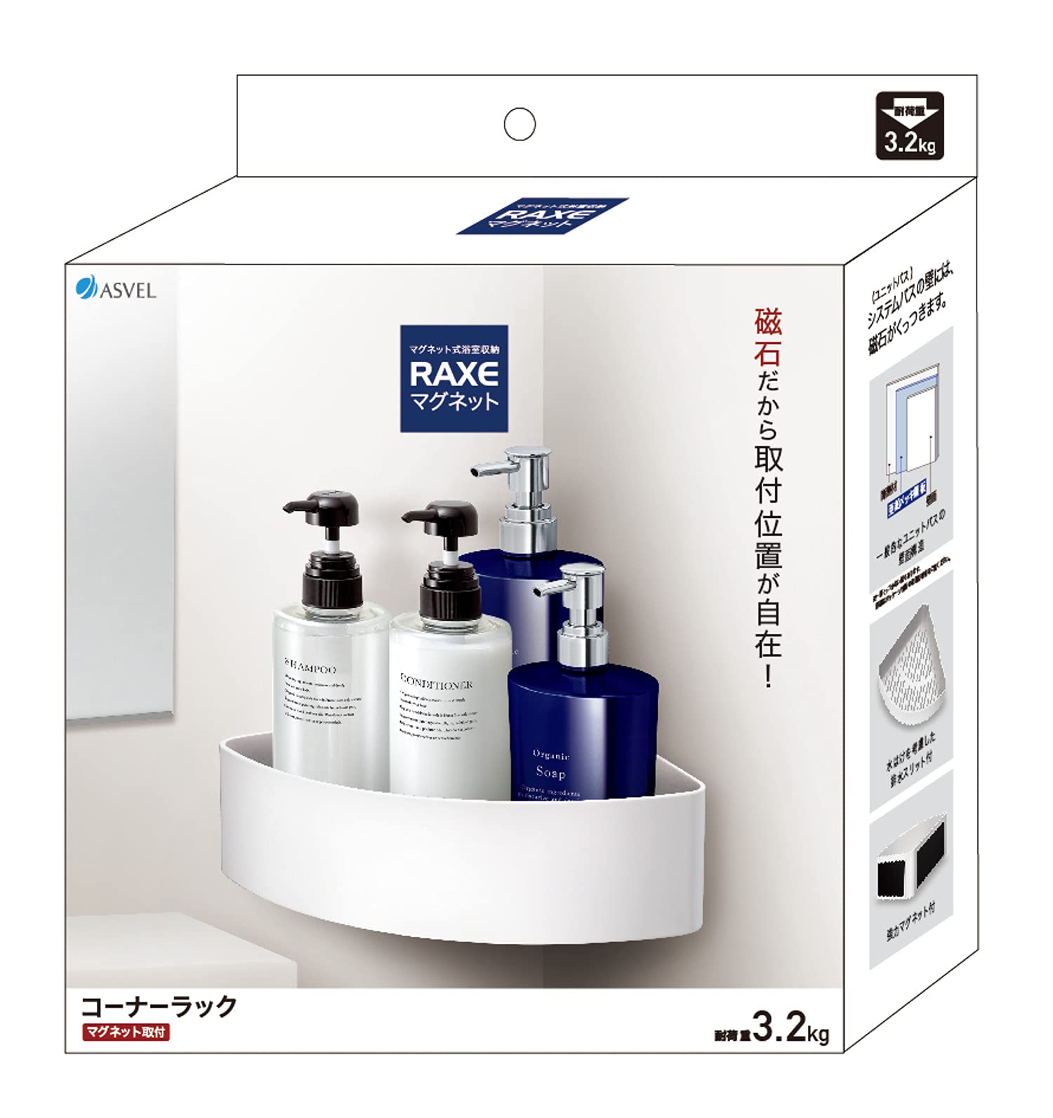 アスベル バス 浴室用 ラックスMG コーナーラック(マグネット)ホワイト 30.9×23×8.6
