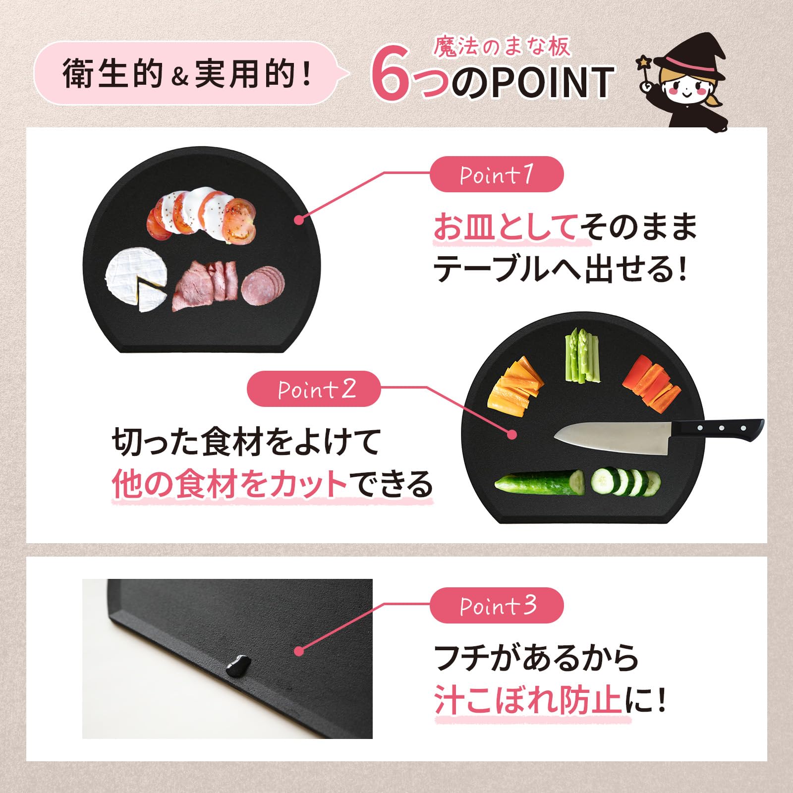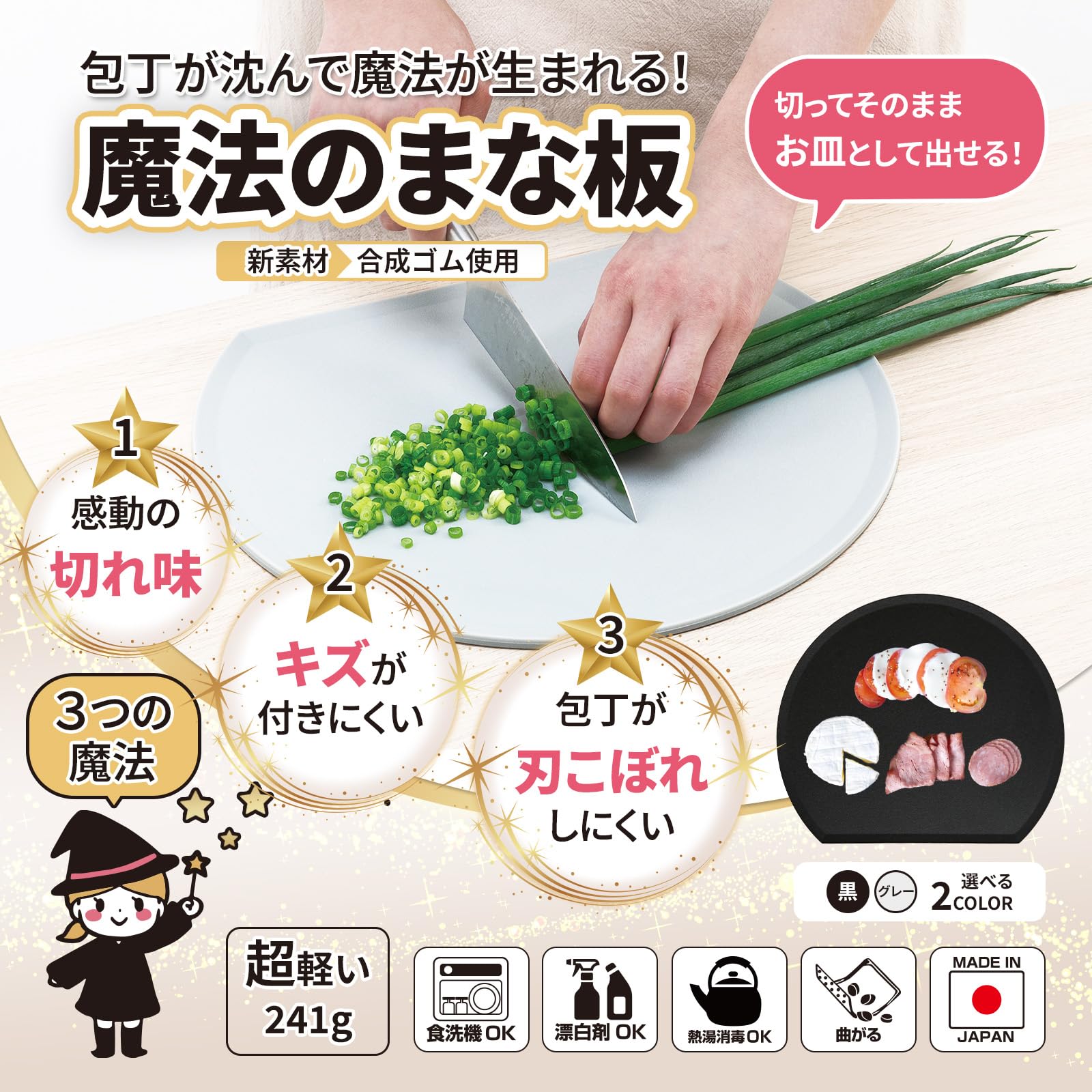 新素材合成ゴムの魔法の弾力で包丁が沈んで感動 の切れ味に!包丁が沈んでもまな板がキズに強い 包丁が刃こぼれしにくい! お皿になってテーブルに出せる。 フチが立って汁こぼれ防止。