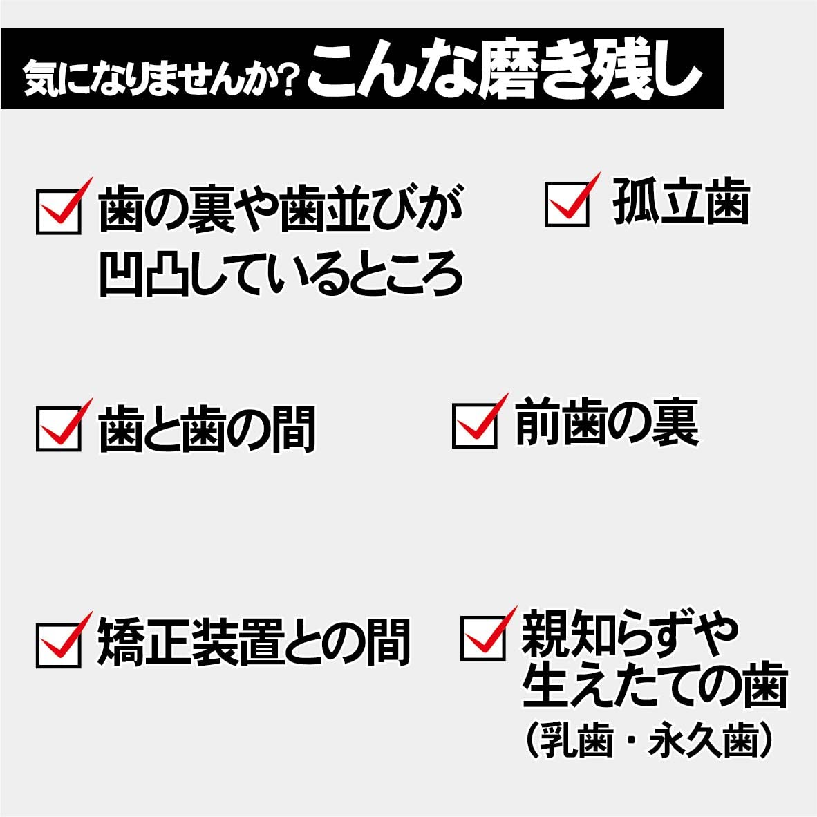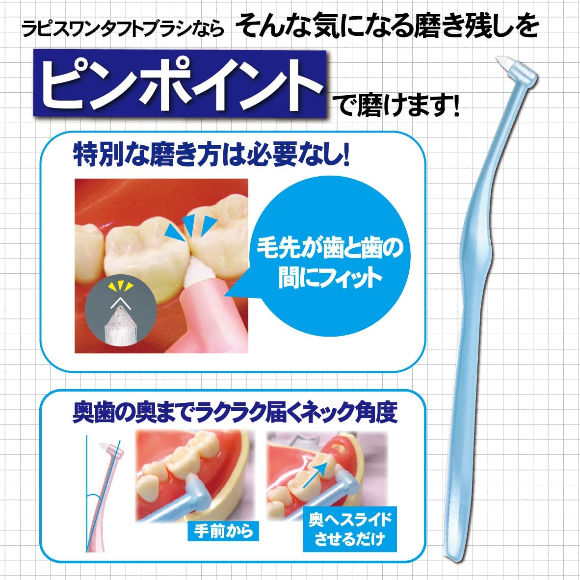 歯間部分、矯正部分の清掃に優れています。奥歯までしっかり届きます。お子様の細部の仕上げ磨きにも使っていただけます。