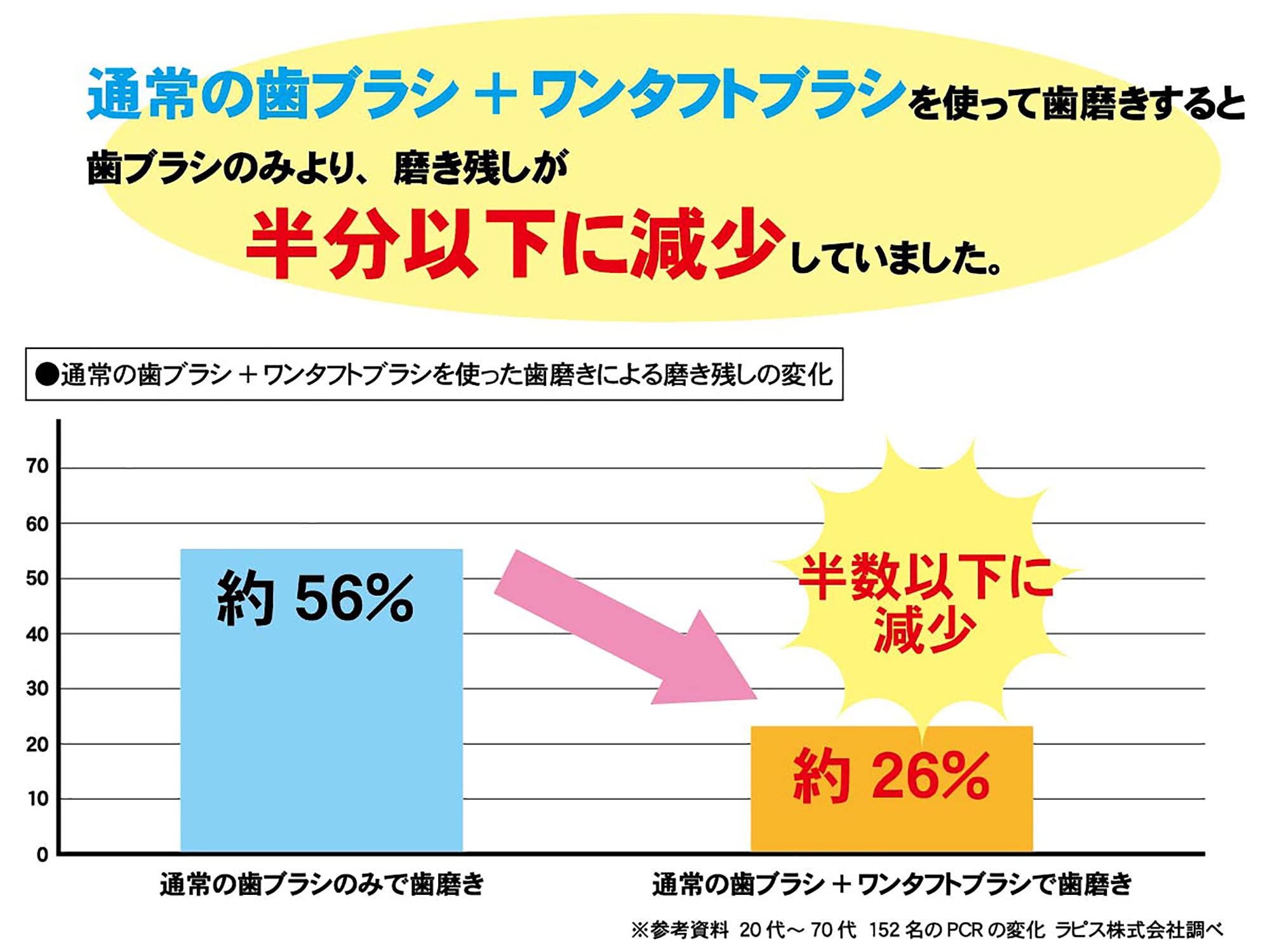 歯みがきの基本は、むし歯や歯周病の原因となる歯垢をキレイに残さず落とすことです。歯磨きは、歯ブラシと歯みがき粉で十分だと思われている方が多いと思いますが、通常の歯ブラシだけでは十分に磨ききれない部分もあります。ハミガキ粉の有効な成分をすみずみまで届け効果を発揮させるには、磨き残し、プラークを除去することが大切です。 世界のトップ、デュポン社製の高品質ナイロン毛を使用しています。毛のカット具合やハンドル・ヘッドの角度など、歯科医院様と共に考えたワンタフトです。