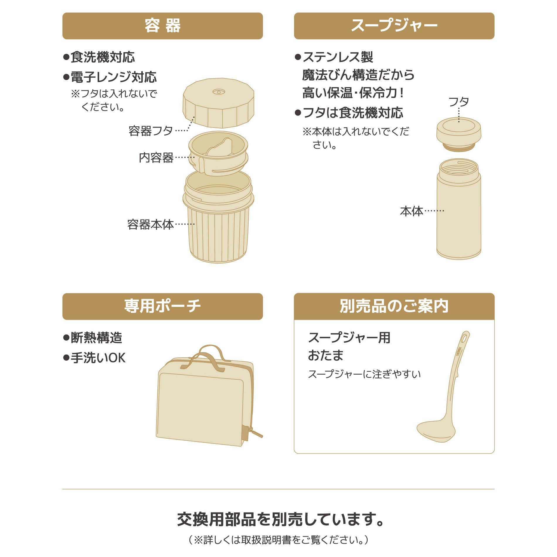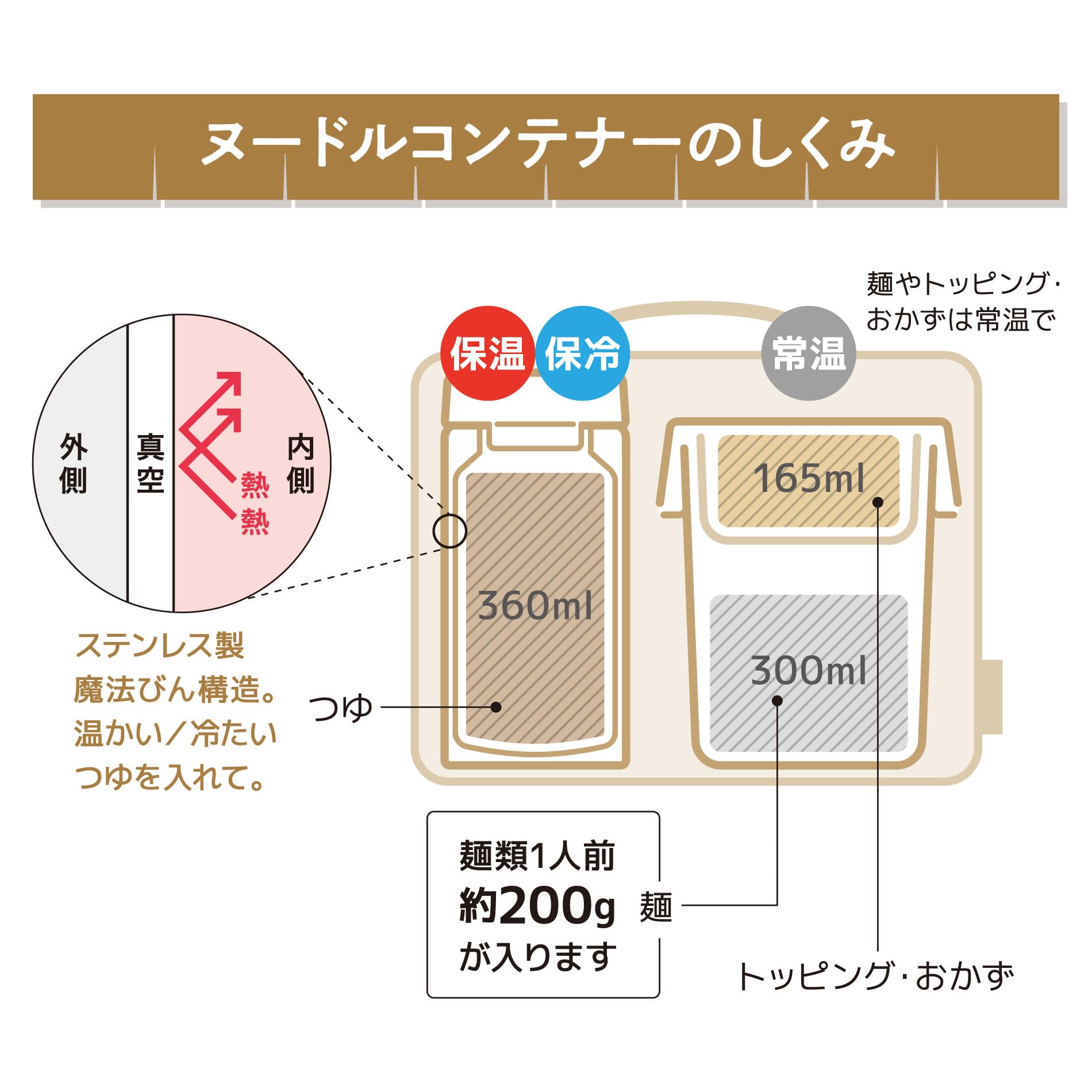 容量:スープジャー/360ml、樹脂容器/300ml(麺類1人前の約200gが入ります)、トッピング・おかず/165ml