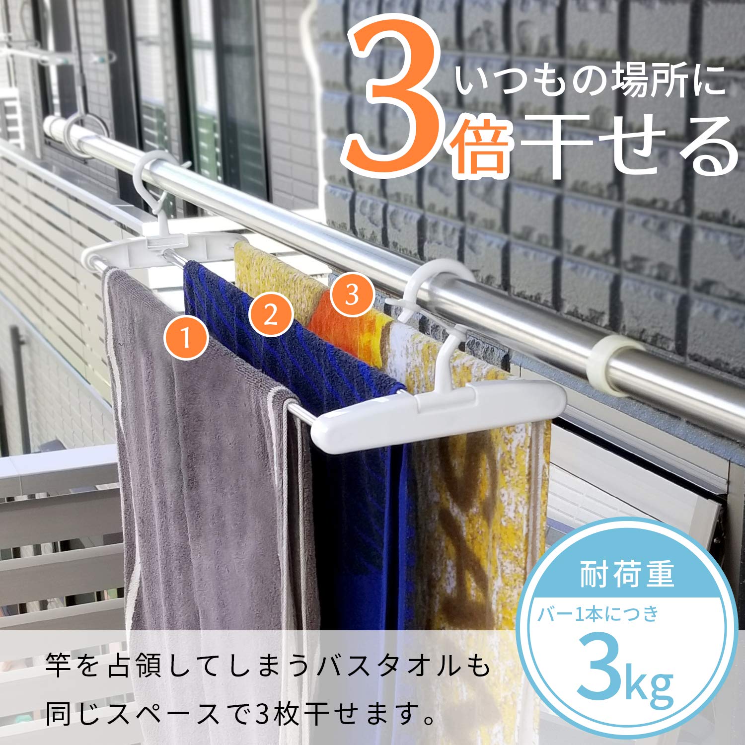●1枚分のスペースで大判バスタオルが3枚干せます。