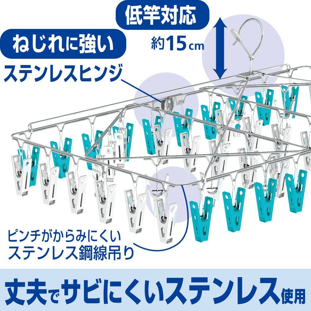 コンパクトフレームにピンチがぎゅっと付いた、丈夫でサビにくいステンレス製ハンガーです。ピンチ54個付き。