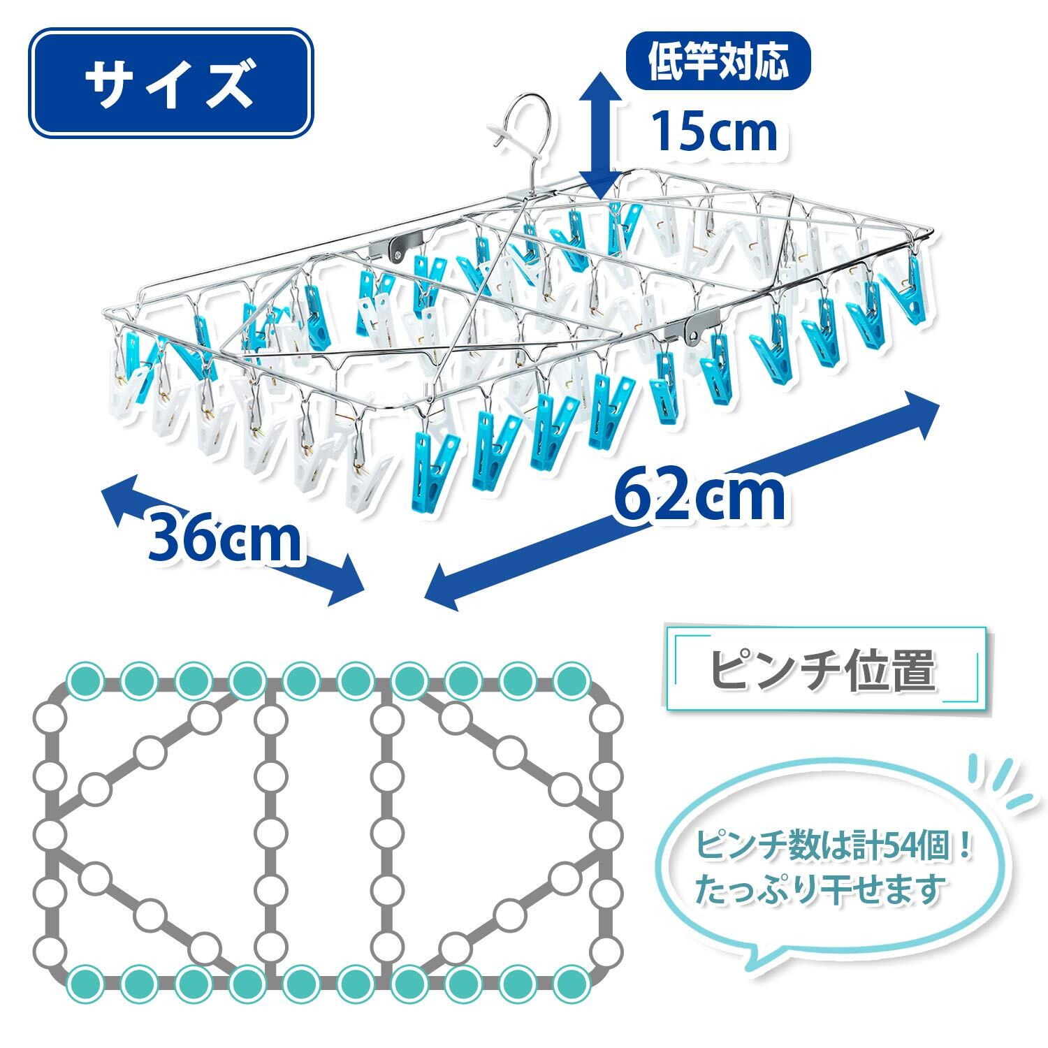 コンパクトサイズでピンチ54個もあり、省スペースで大量干しできる。
