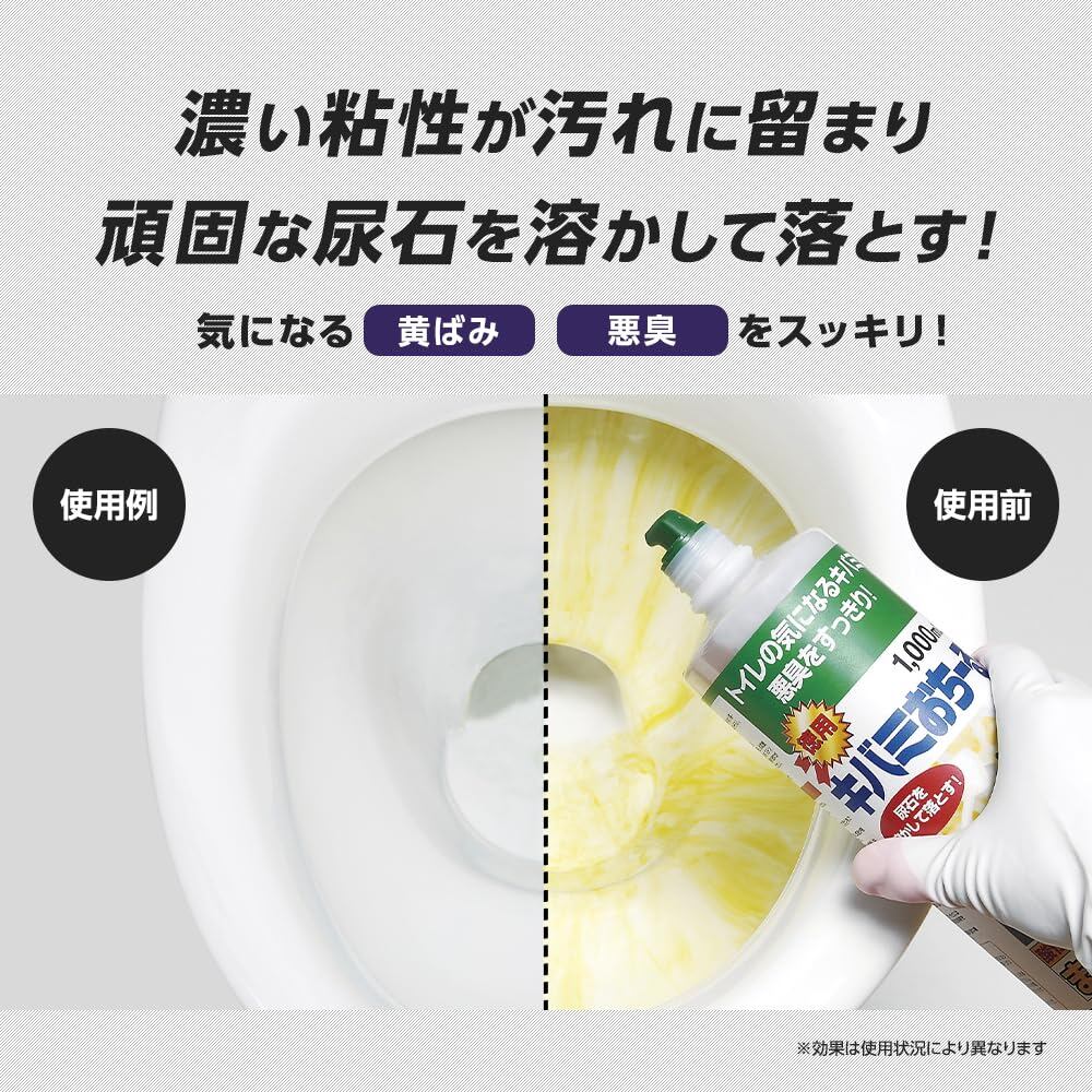 【商品概要】容量/1000ml、使用量の目安/一便器に100mL〜150mLまで、成分/塩酸(9.5%)・界面活性剤(非イオン系・ポリオキシエチレンアルキルエーテル)・増粘剤、液性/酸性、原産国/日本