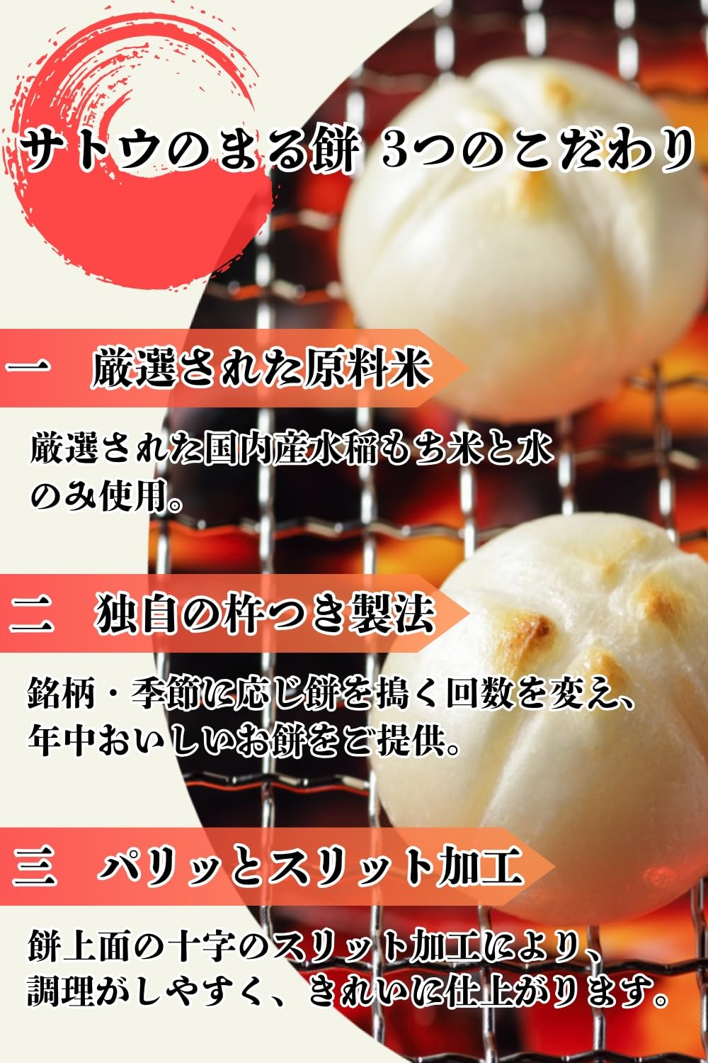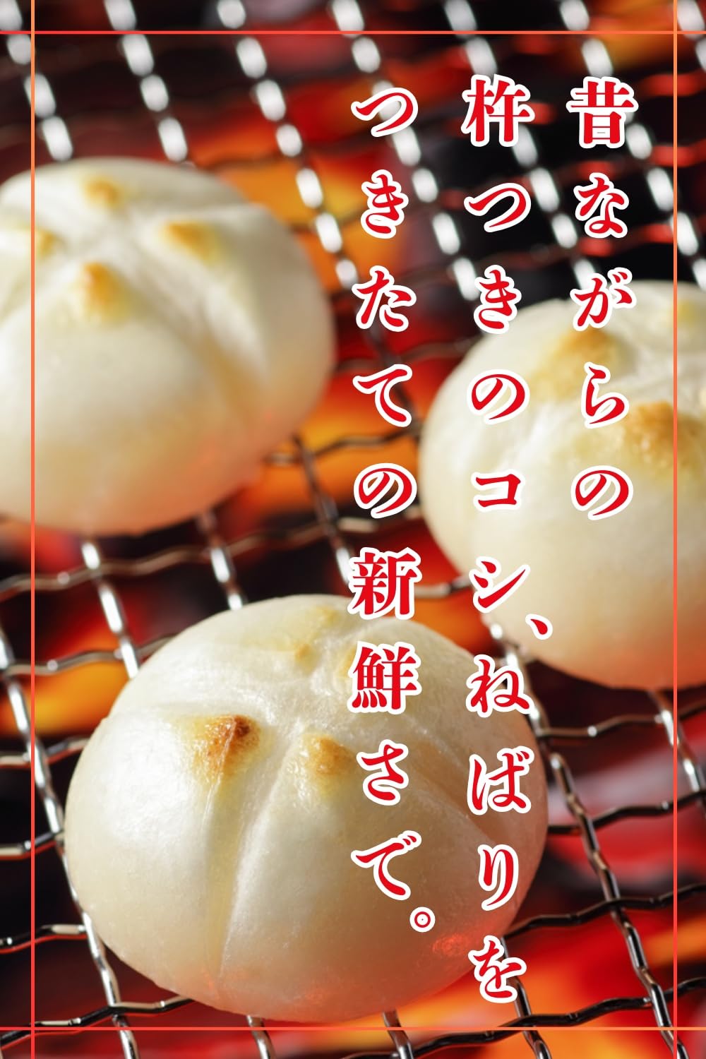 1.オーブントースターで餅の表面に焼き色がつくまで4~5分焼いてください。 2.トースターの扉は開けずにスイッチを切り、そのまま2分くらいおいてください。 3.餅の中までふっくらと焼きあがります。 ※焼き加減はオーブントースターの機種により異なりますので、加熱時間を調節してください。