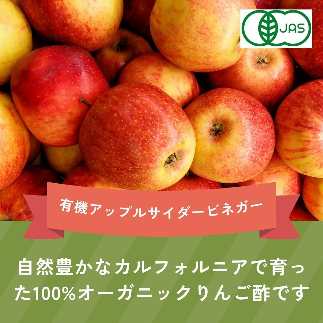 自然豊かなカリフォルニアで、有機りんごから作った100%ピュアなオーガニックりんご酢です。有機りんごを低温圧搾して抽出(コールドプレス製法)したストレート果汁からりんご酒を造り、それをお酢に醸造しました。お料理やドリンク原料としてお楽しみください。