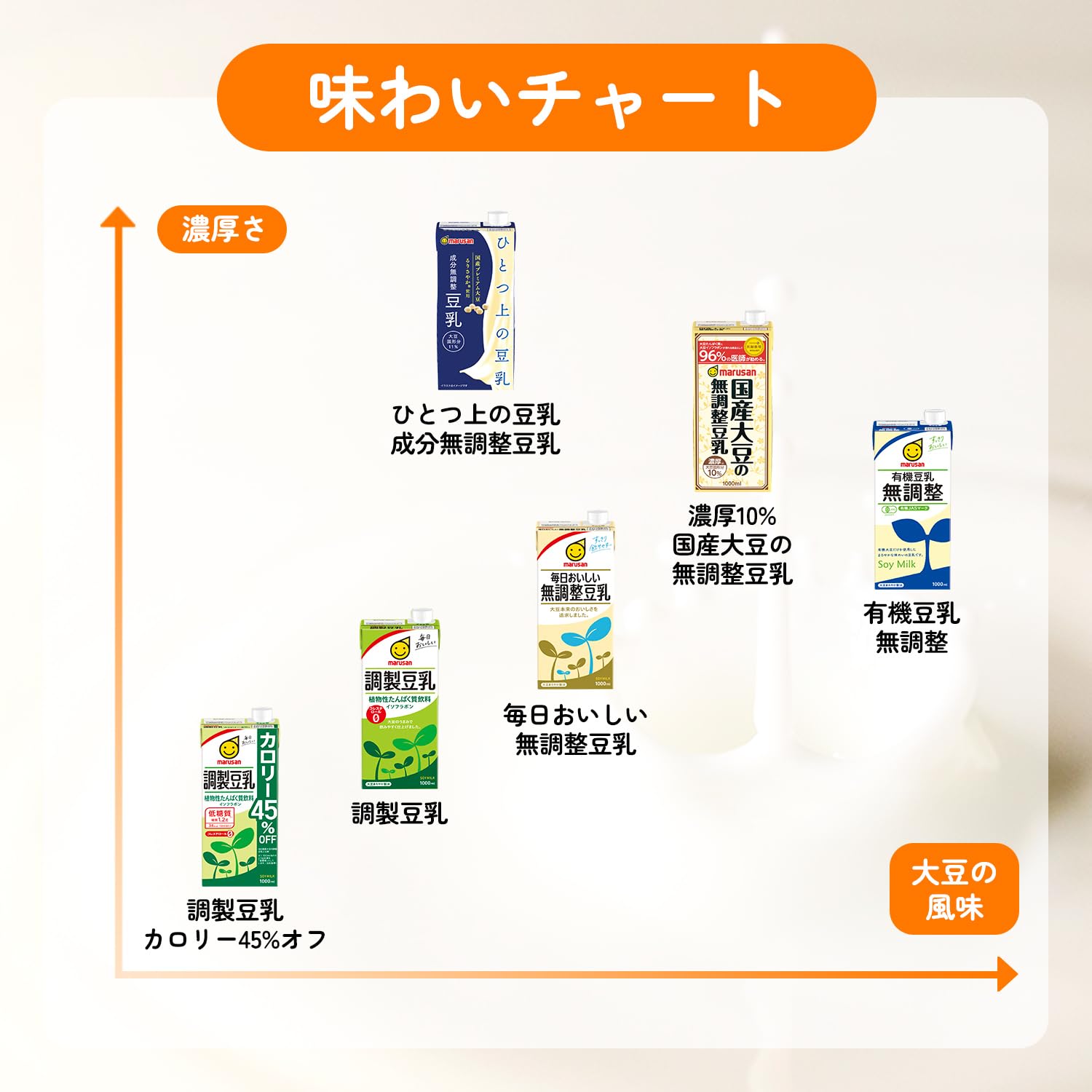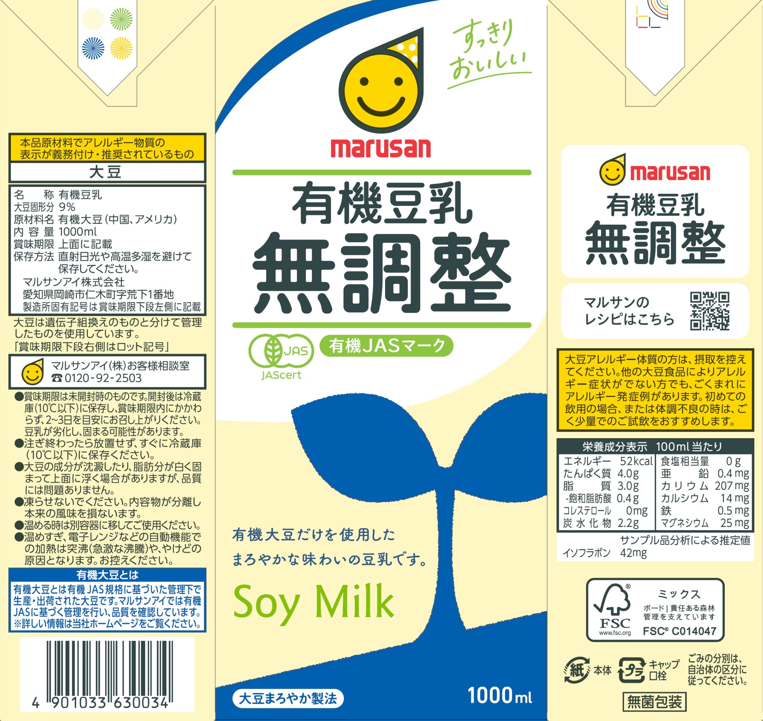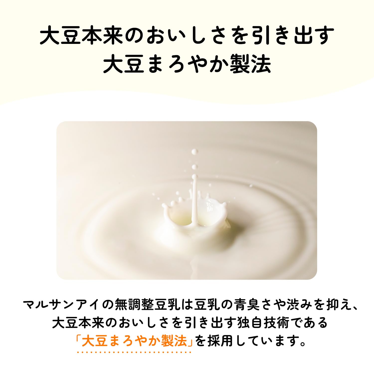 有機大豆だけを使用し、大豆本来のおいしさを追求した自然派志向の豆乳でございます。大豆固形分 9%の豆乳です。有機大豆を使用した無調整豆乳です。大豆まろやか製法という、当社独自の酵素失活システムの総称により、大豆の渋み等嫌な味を抑えて、大豆本来のおいしさを引き出しました。