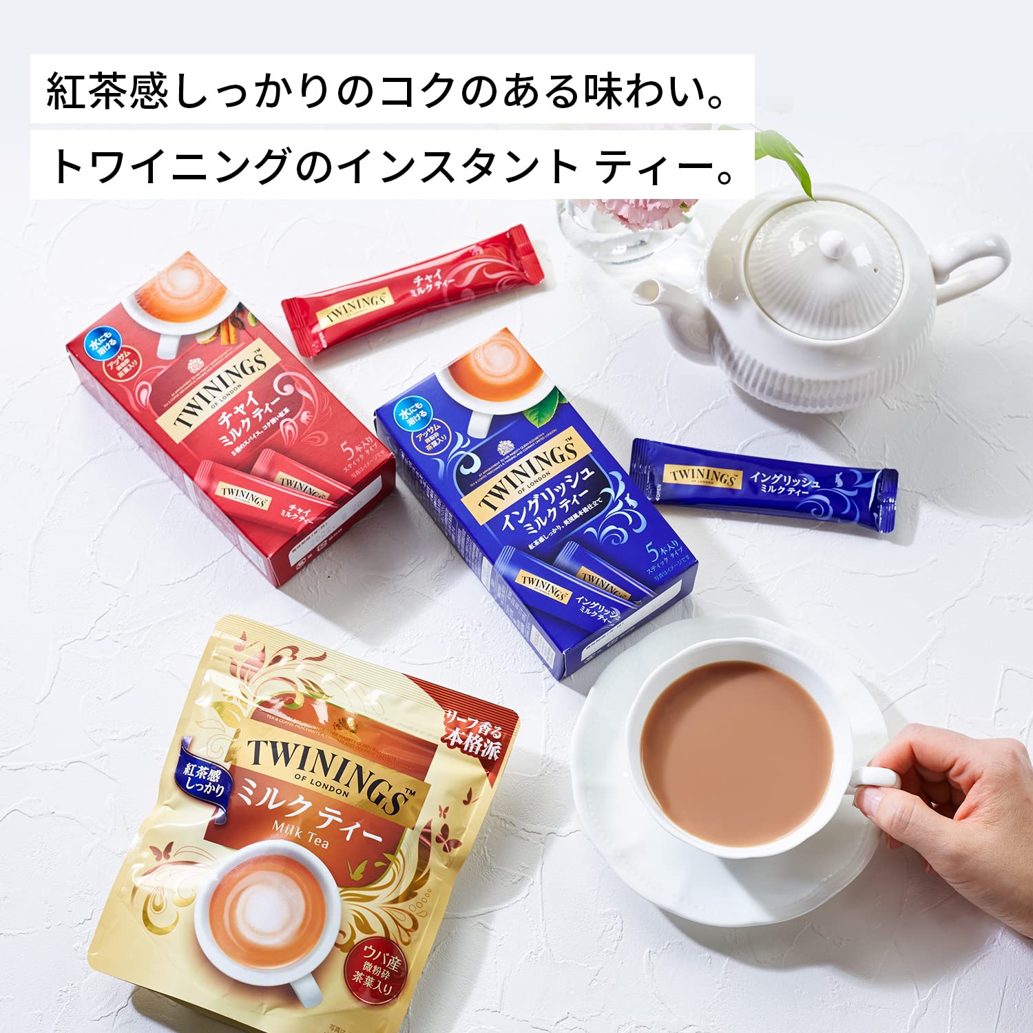 イギリスで親しまれているような、濃厚な紅茶のコクと香りが味わえるミルクティー。アッサム微粉砕茶葉を加え、紅茶本来のコクと旨み、芳醇な香りをいかした贅沢な味わいです。水にも溶ける! アッサム微粉砕紅茶葉入り。【スティック&インスタント】